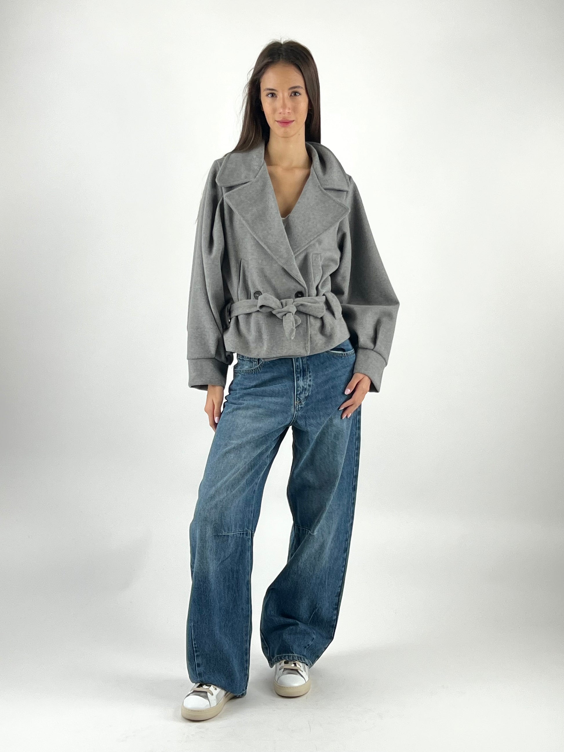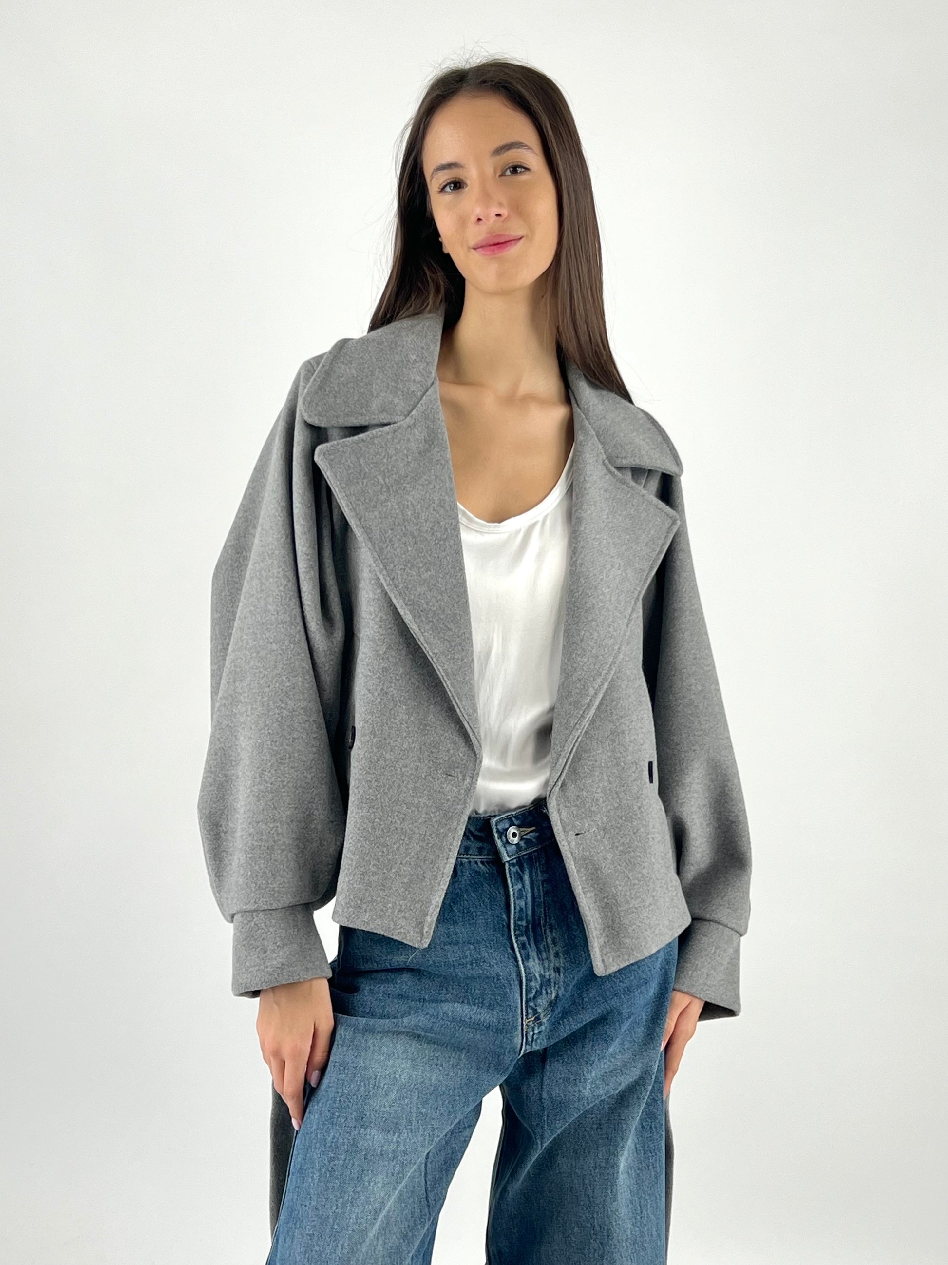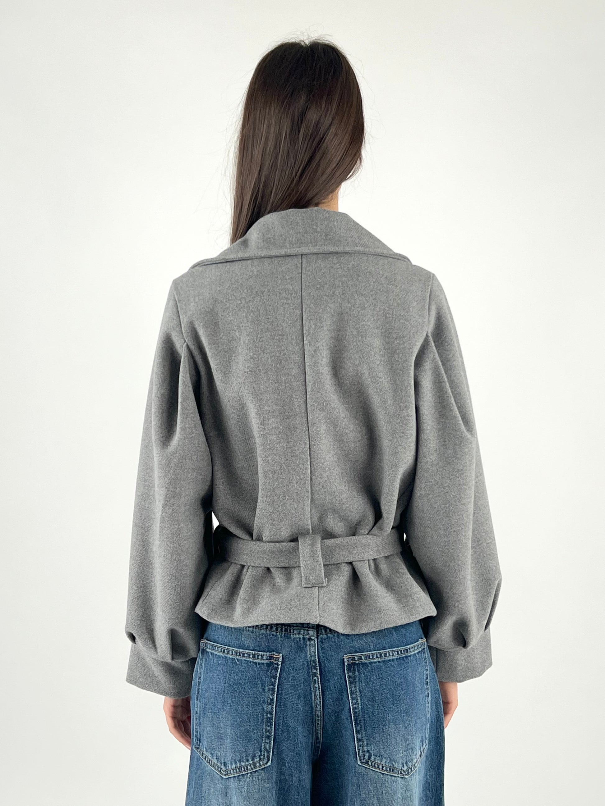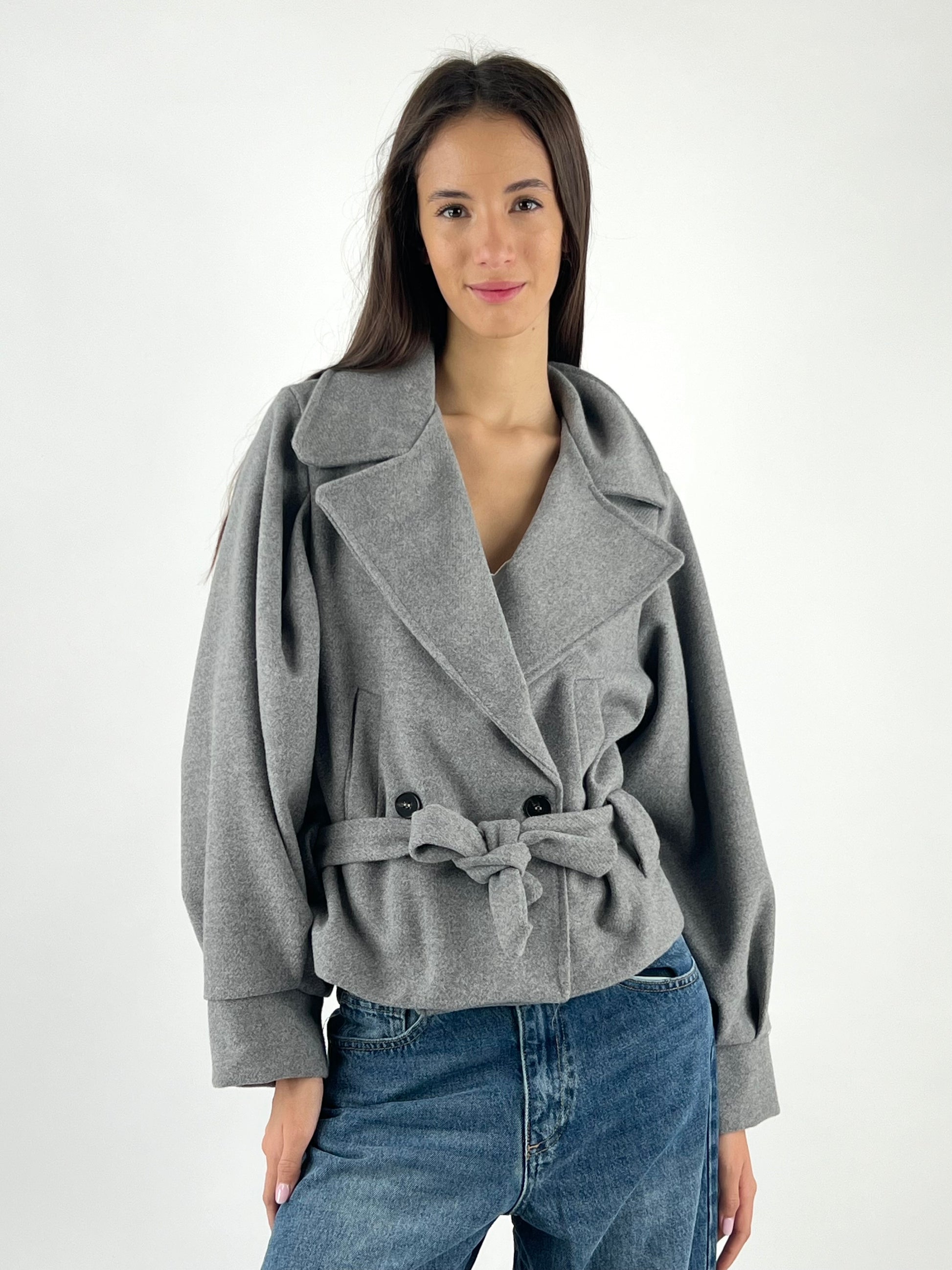 - Giaccone corto doppiopetto con manica a campana, cintura e tasche laterali