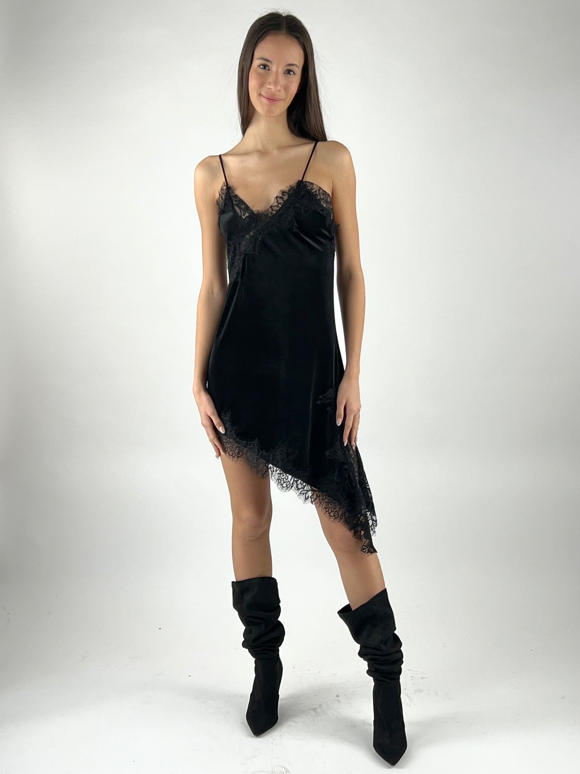 - Abito sottoveste asimmetrico in ciniglia con bordi in pizzo e spallina regolabile