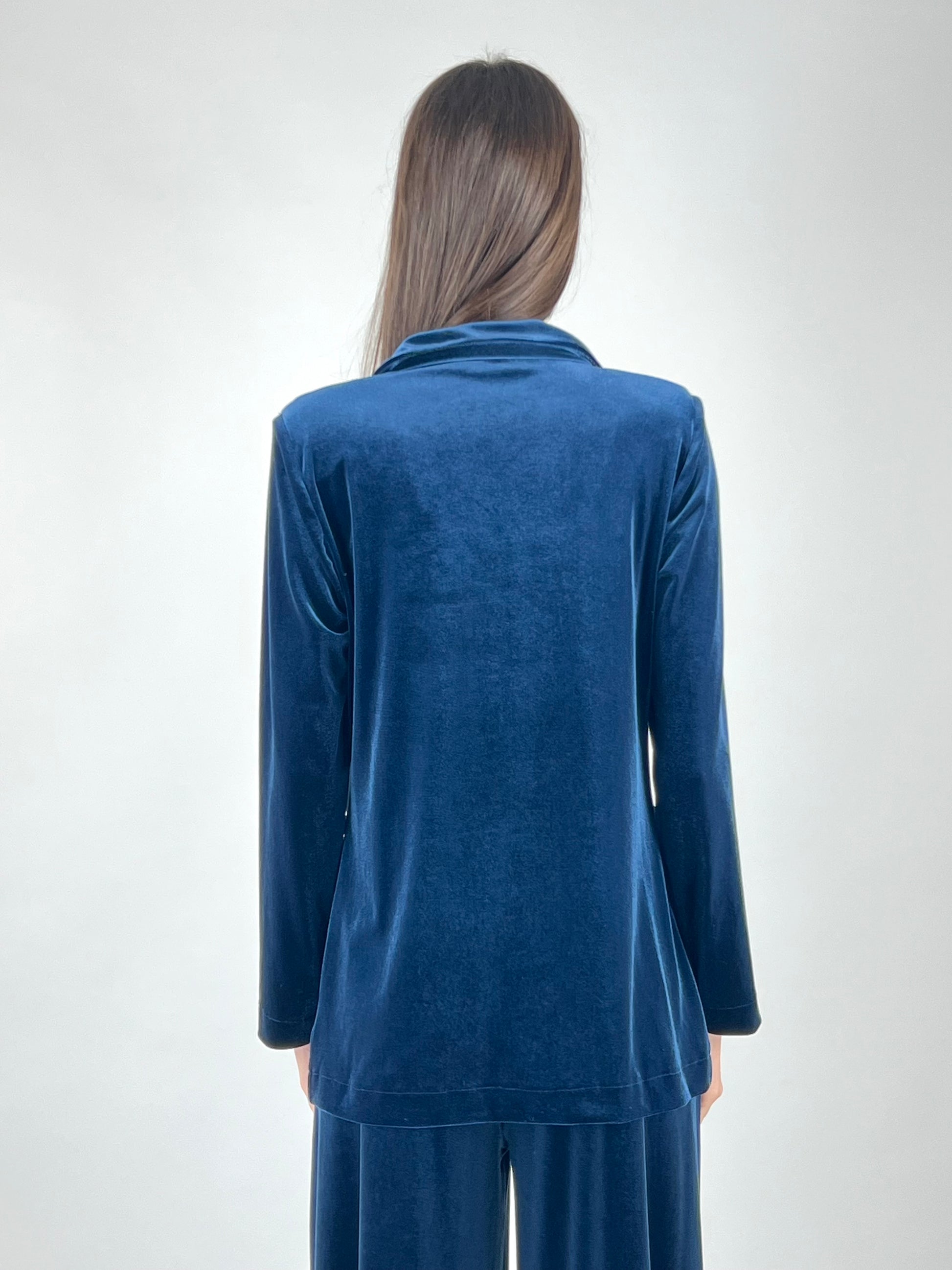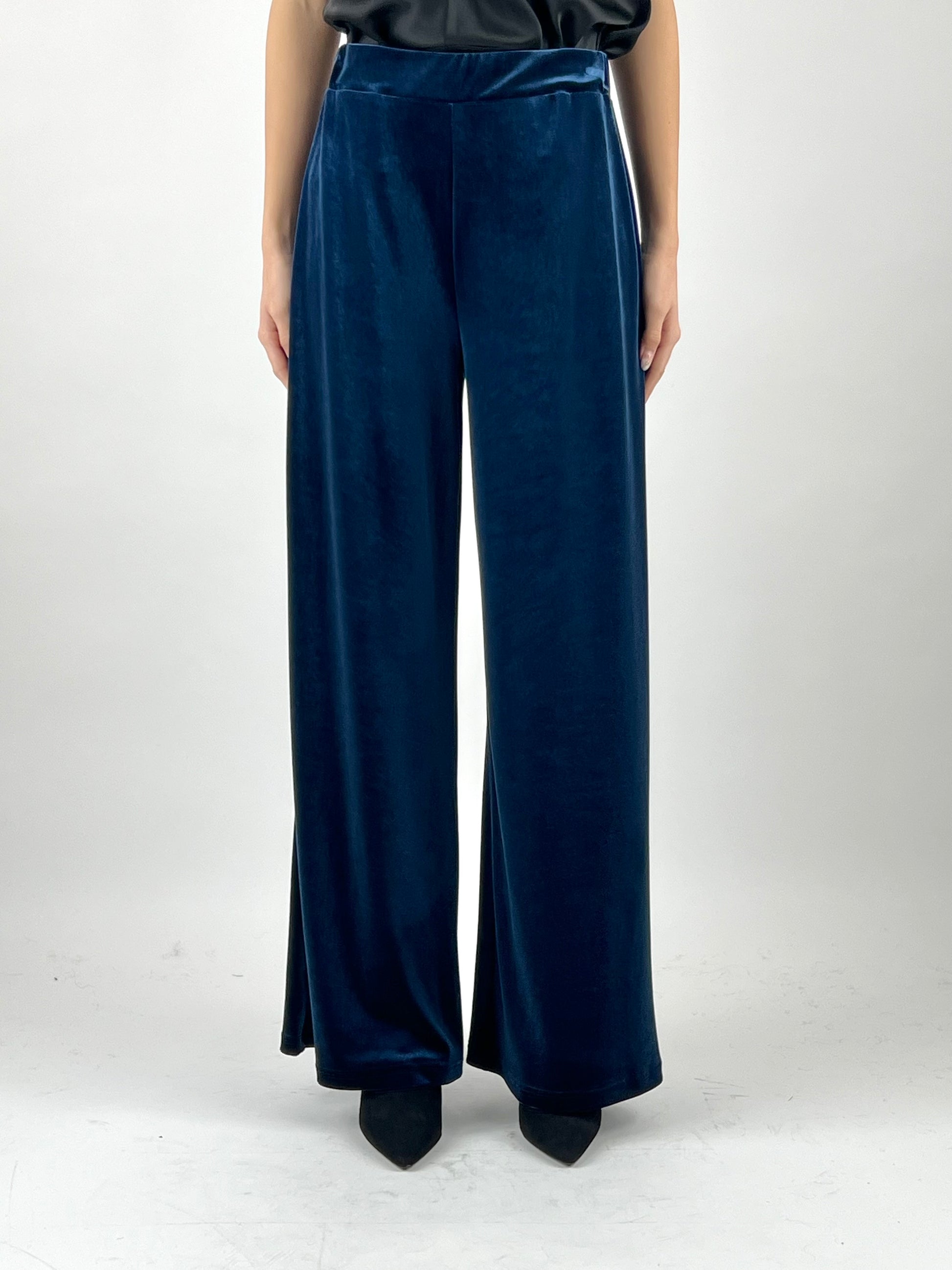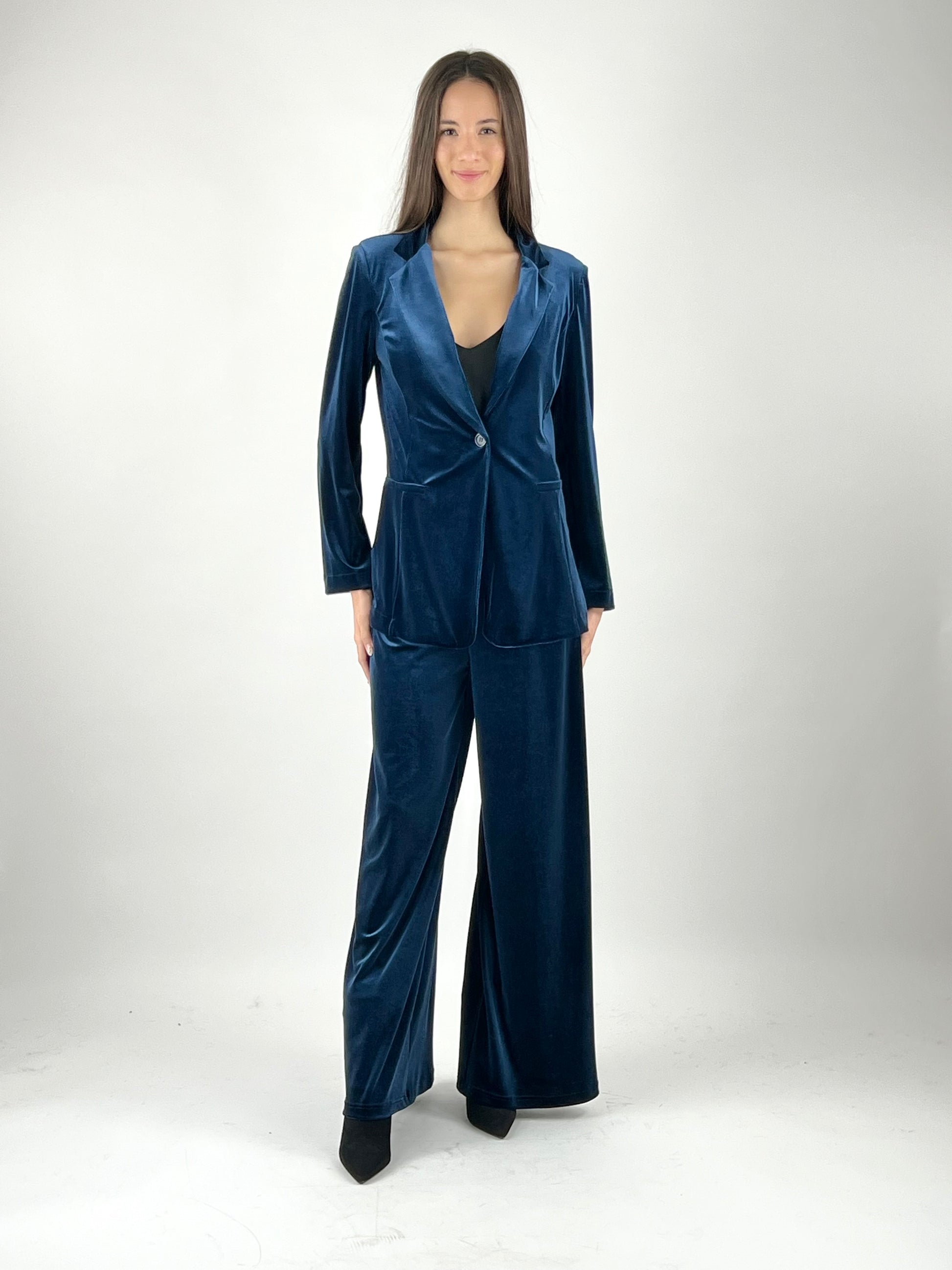 - Completo in ciniglia composto da giacca monopetto e tasche laterali, pantalone palazzo con elastico in vita