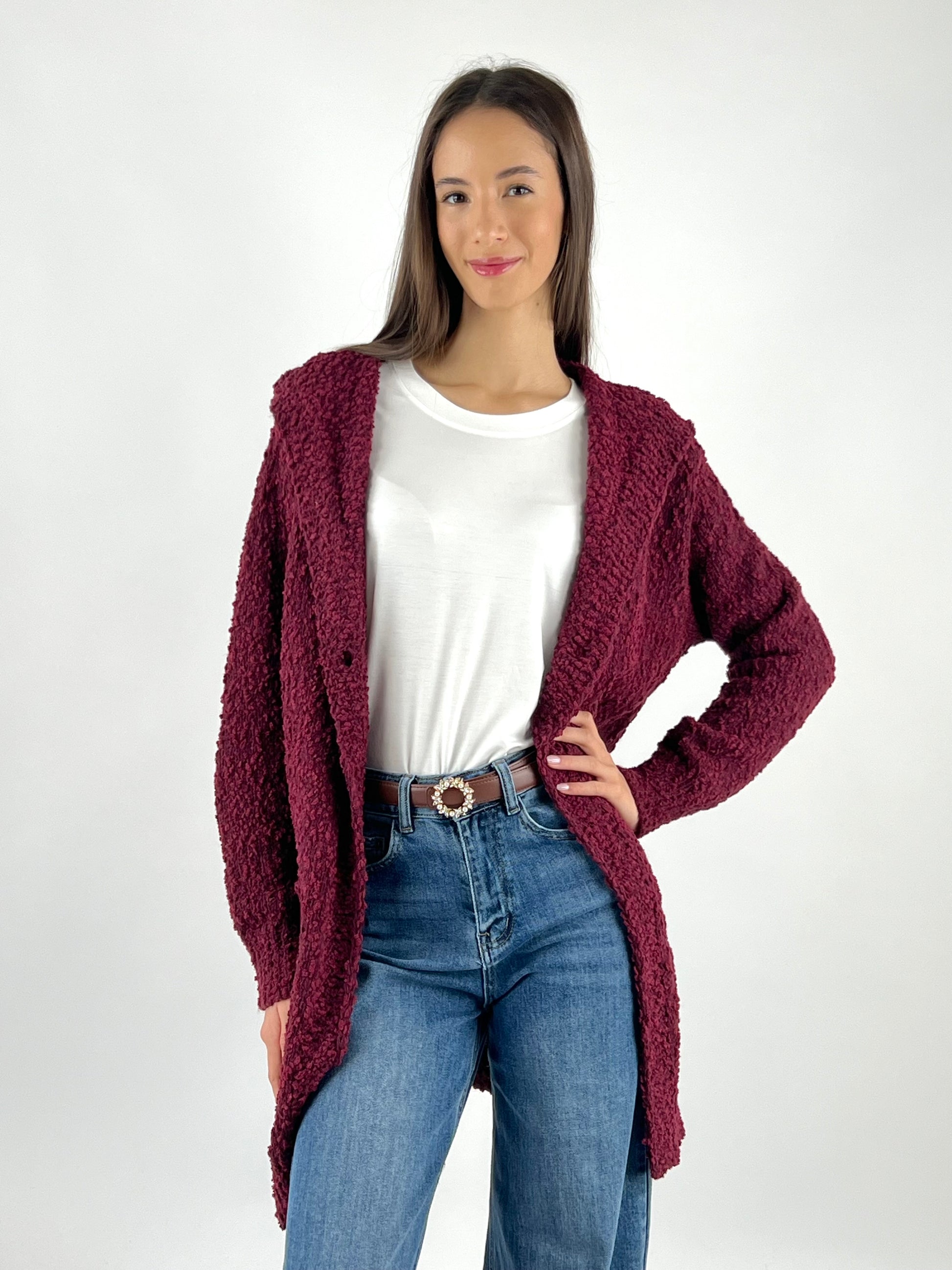 - Maxi cardigan con cappuccio, bottone gioiello e tasche