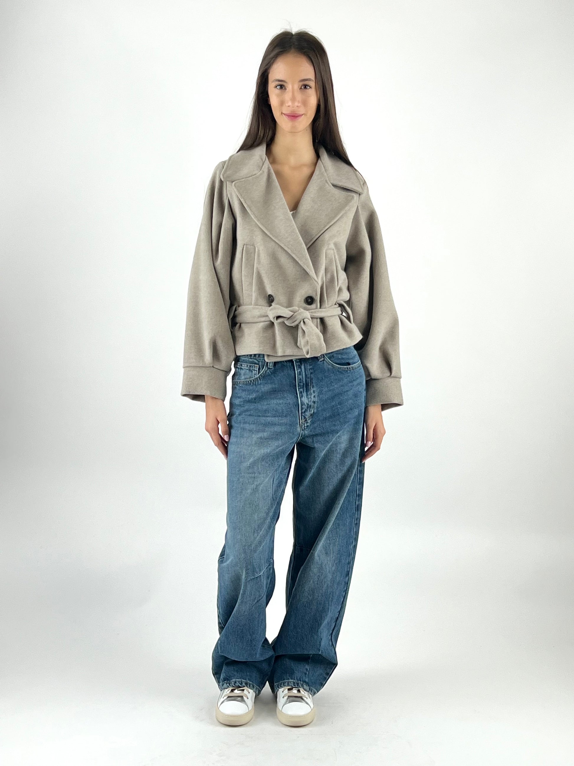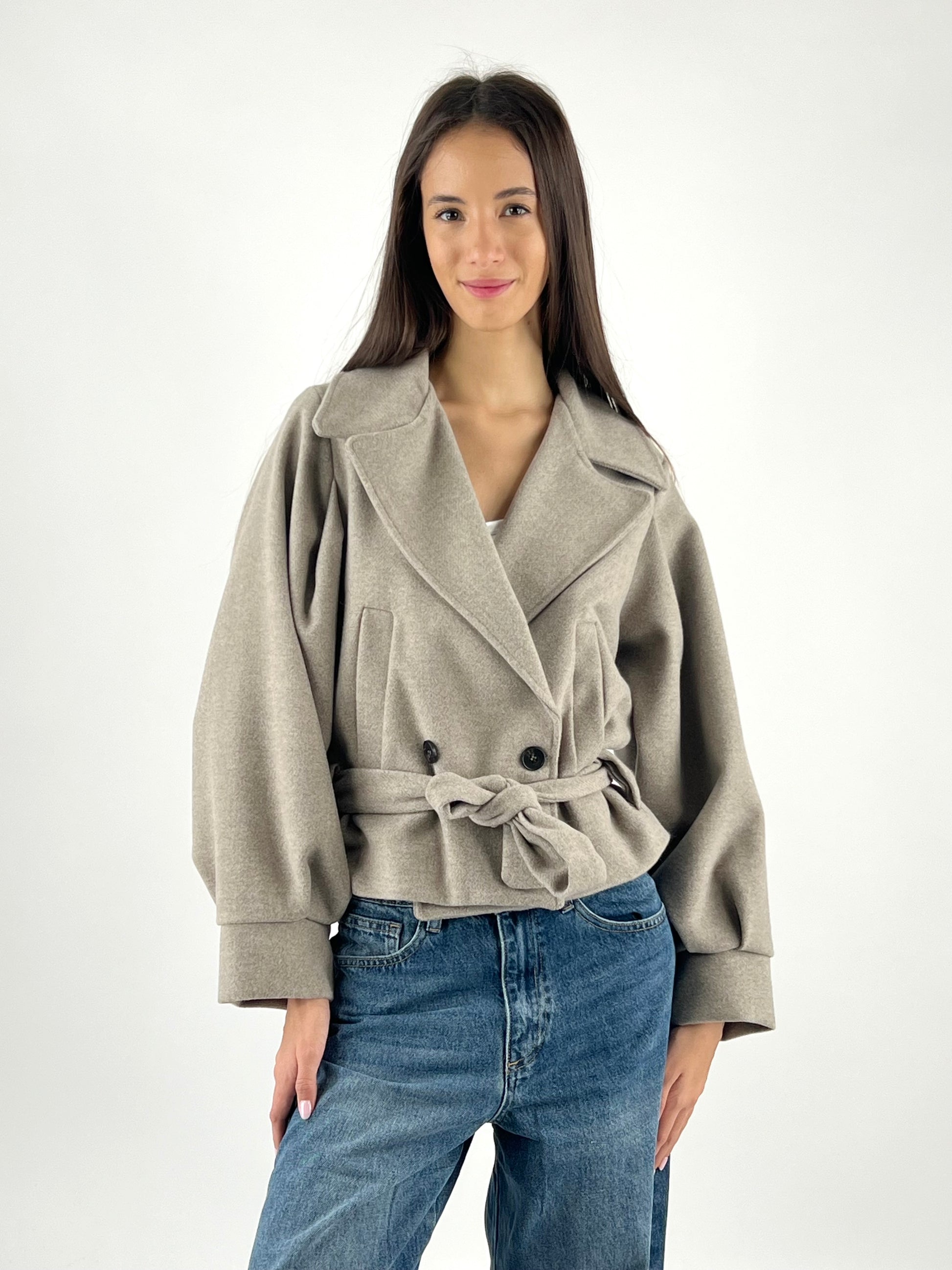 • Giaccone corto doppiopetto con manica a campana, cintura e tasche laterali
