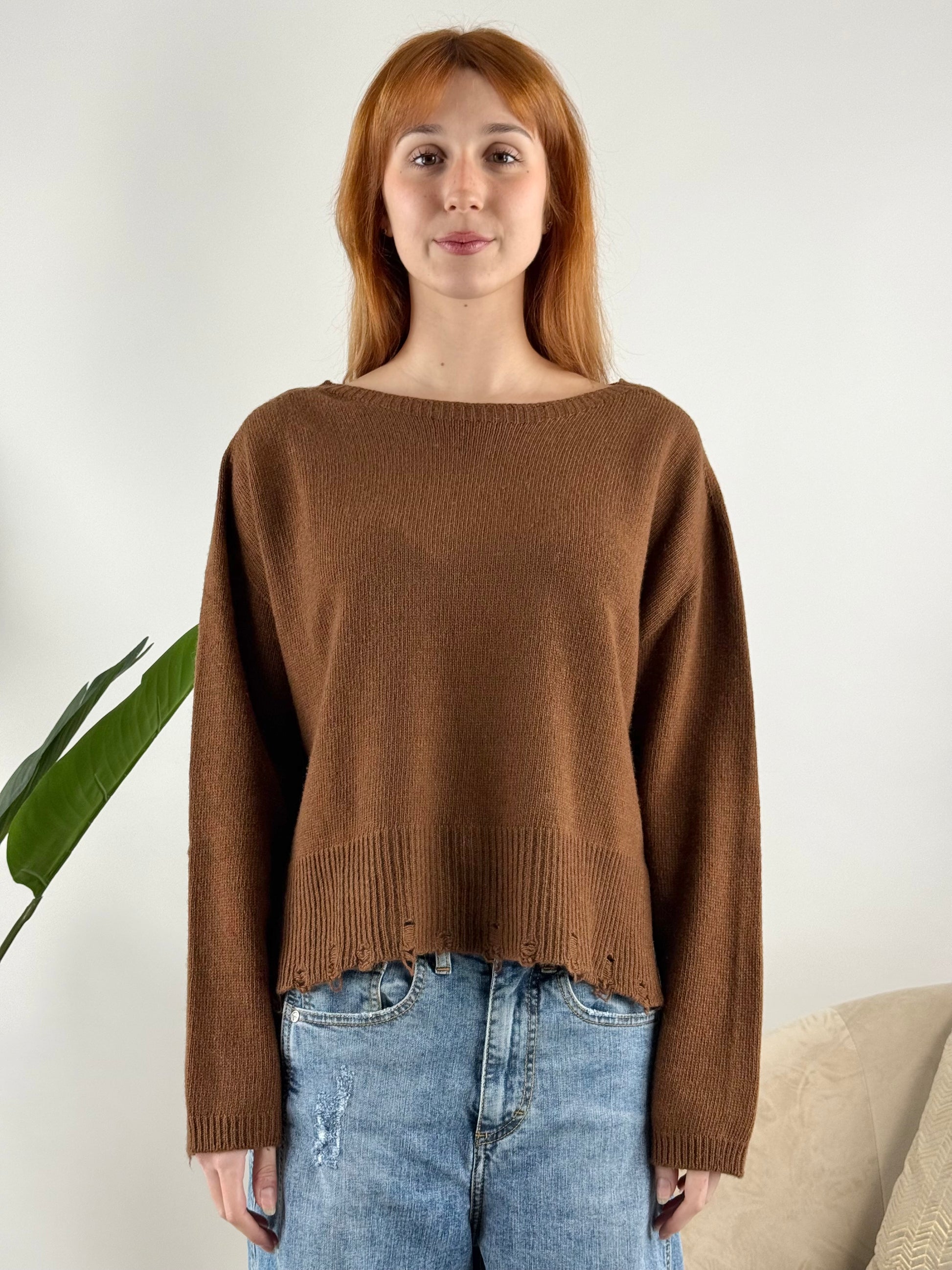 - Maglia asimmetrica con scollo a barca e rotture al fondo