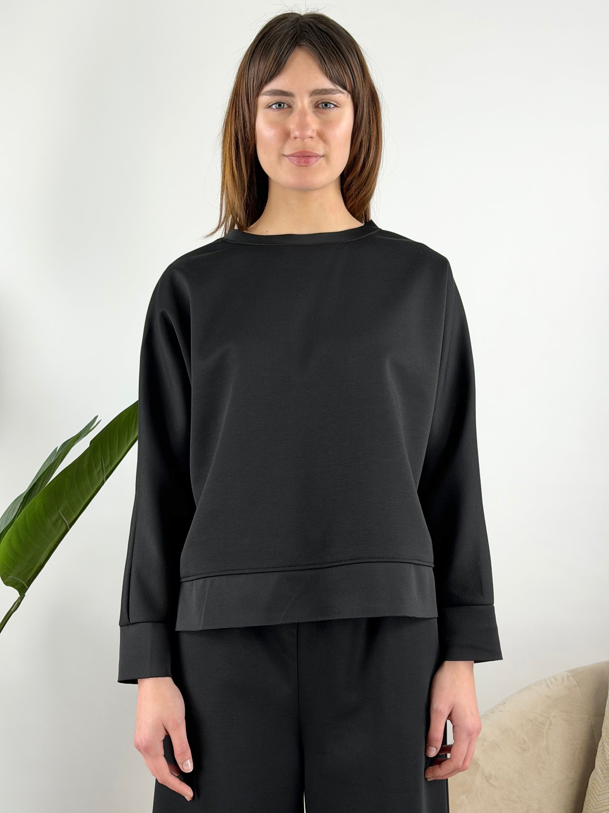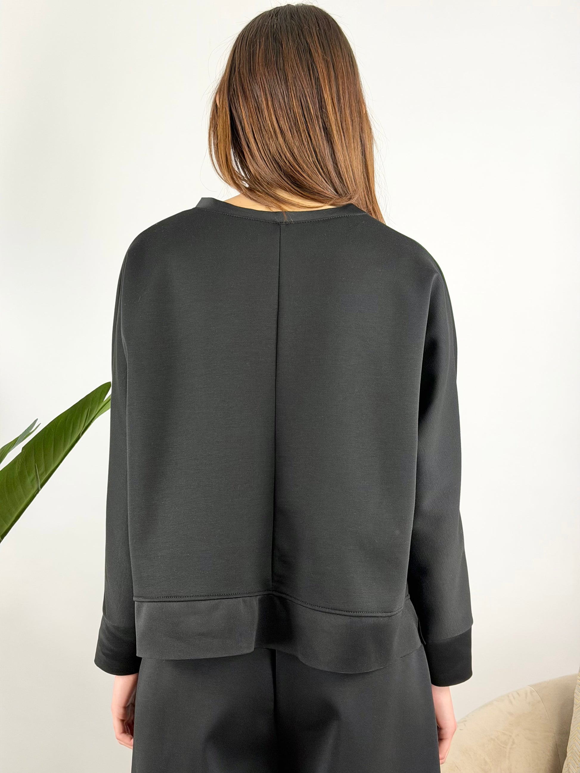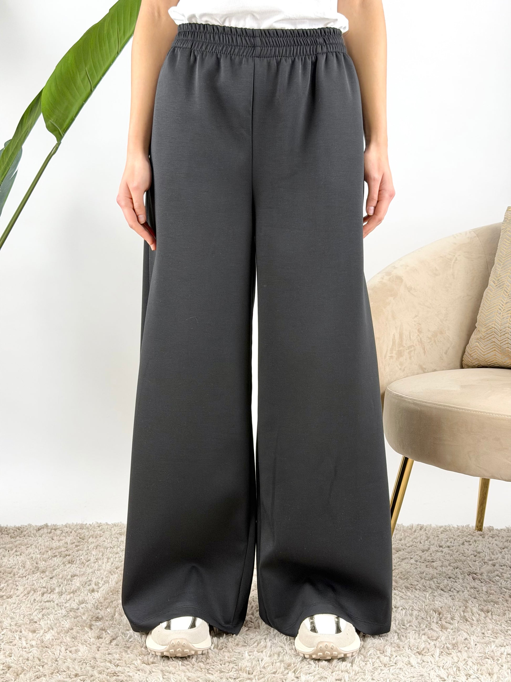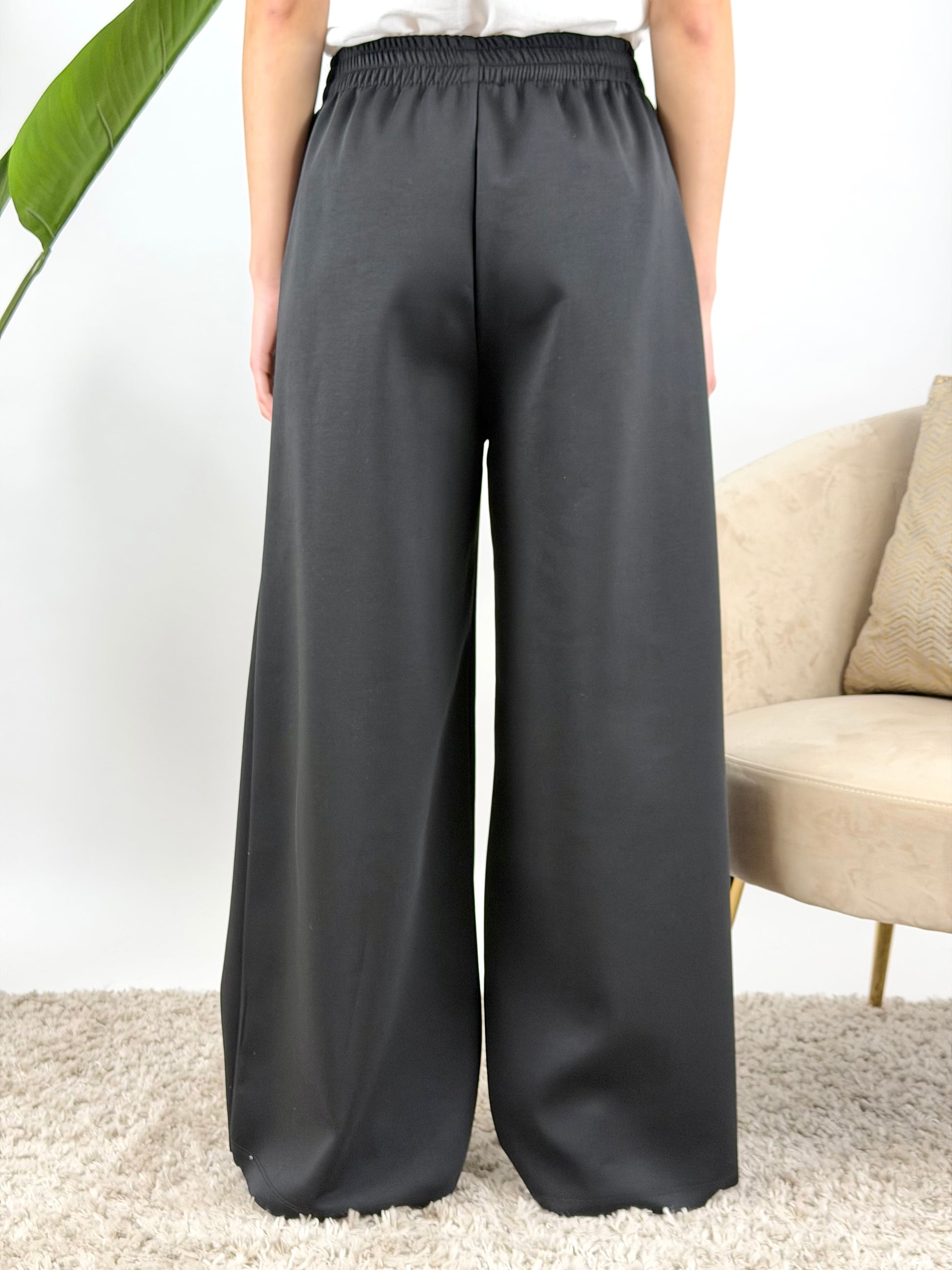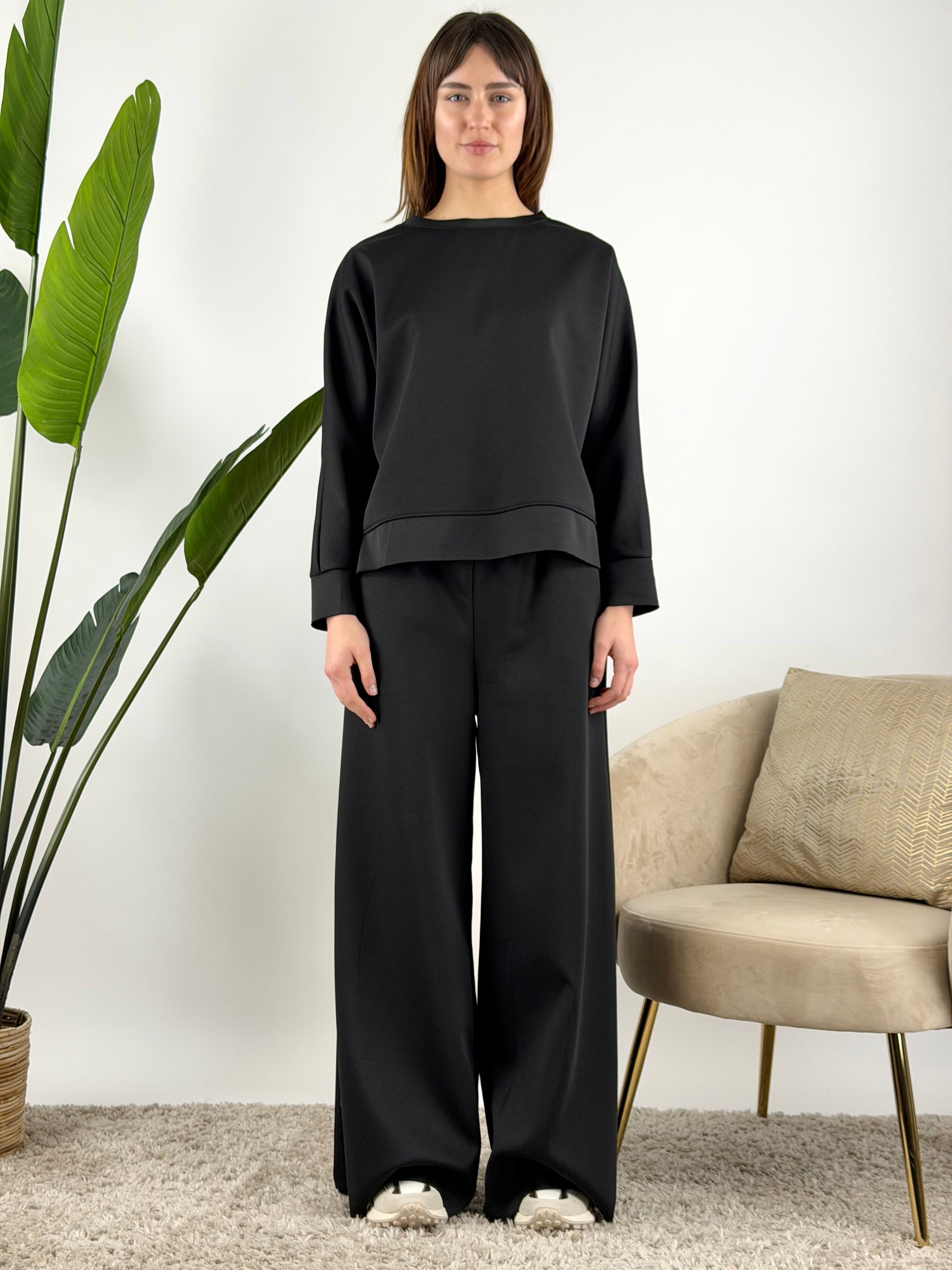 - Tuta scuba composta da maglia girocollo a scatola con spacchi laterali e pantalone a palazzo con elastico in vita