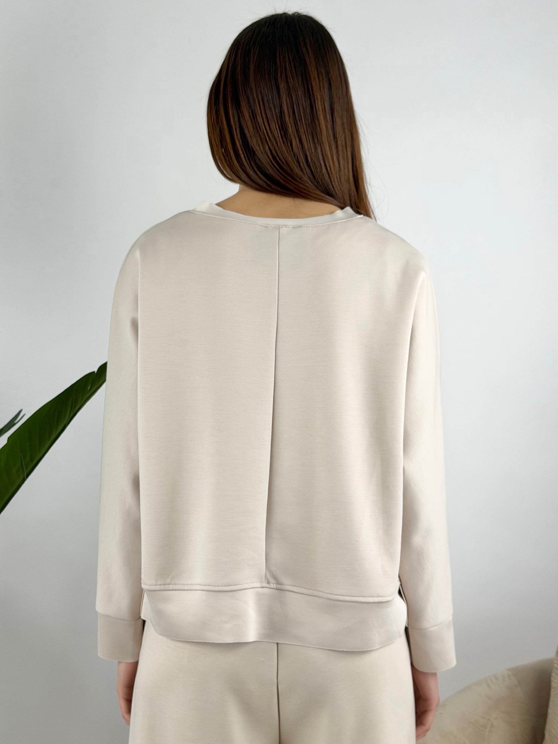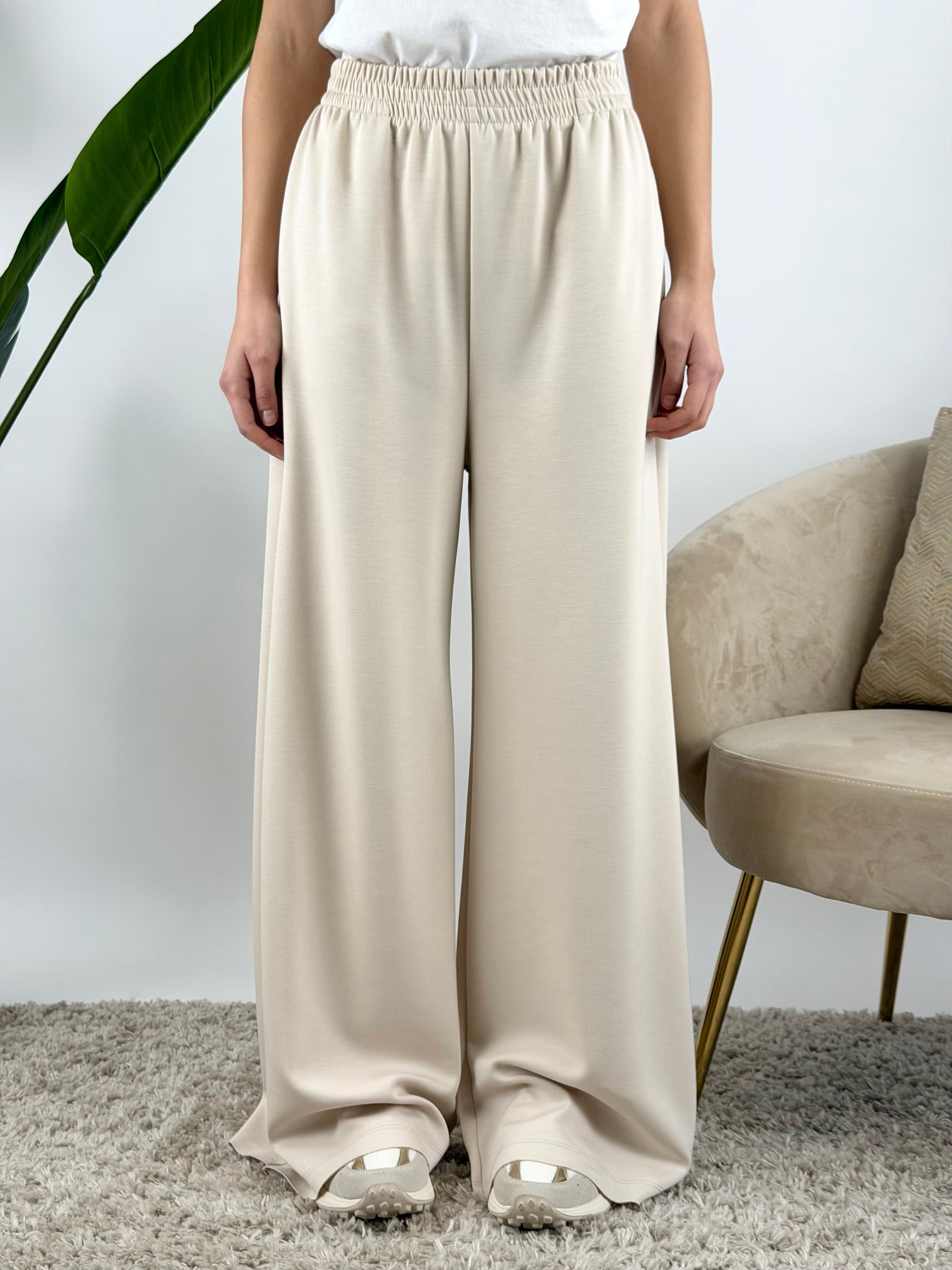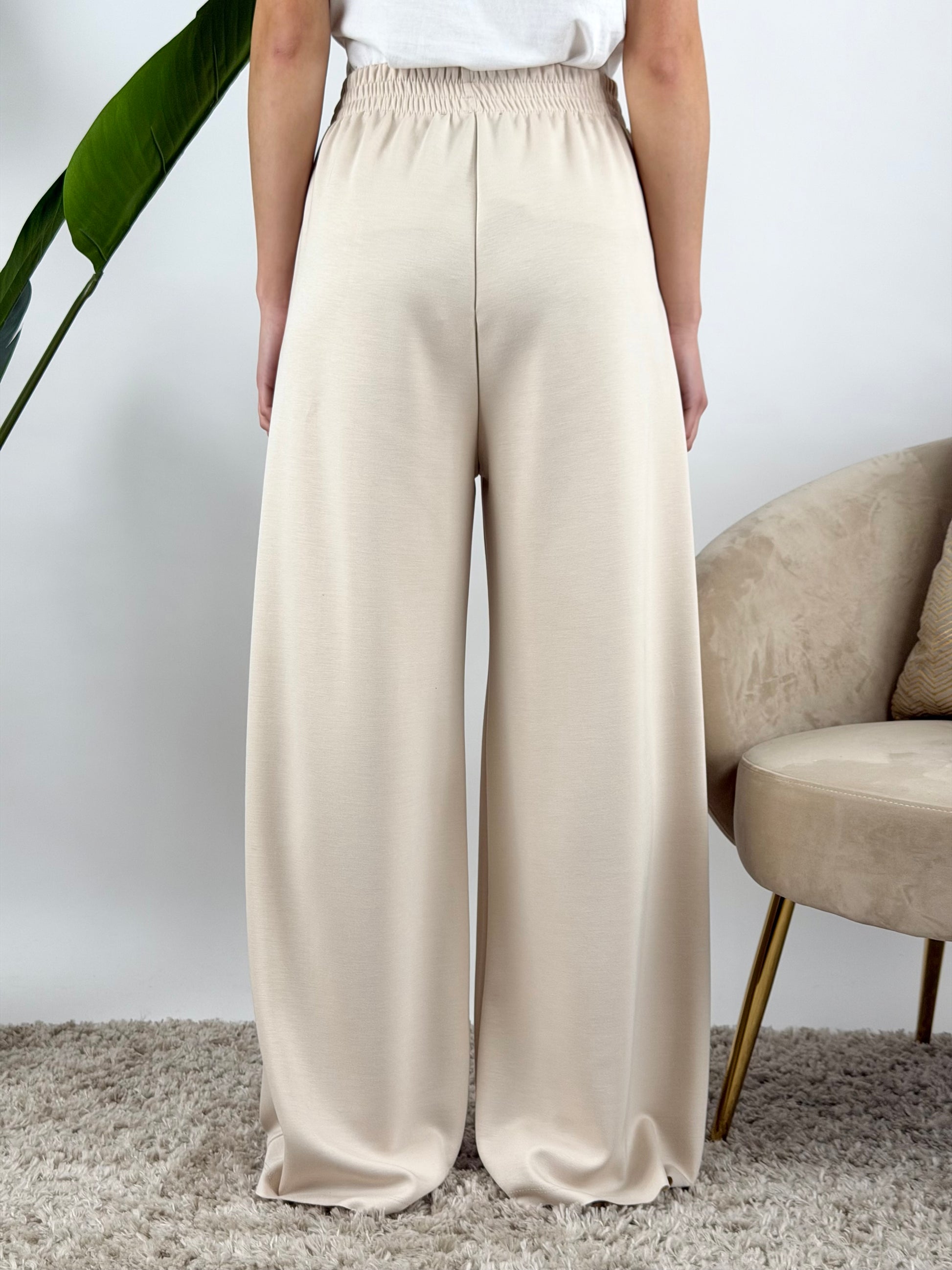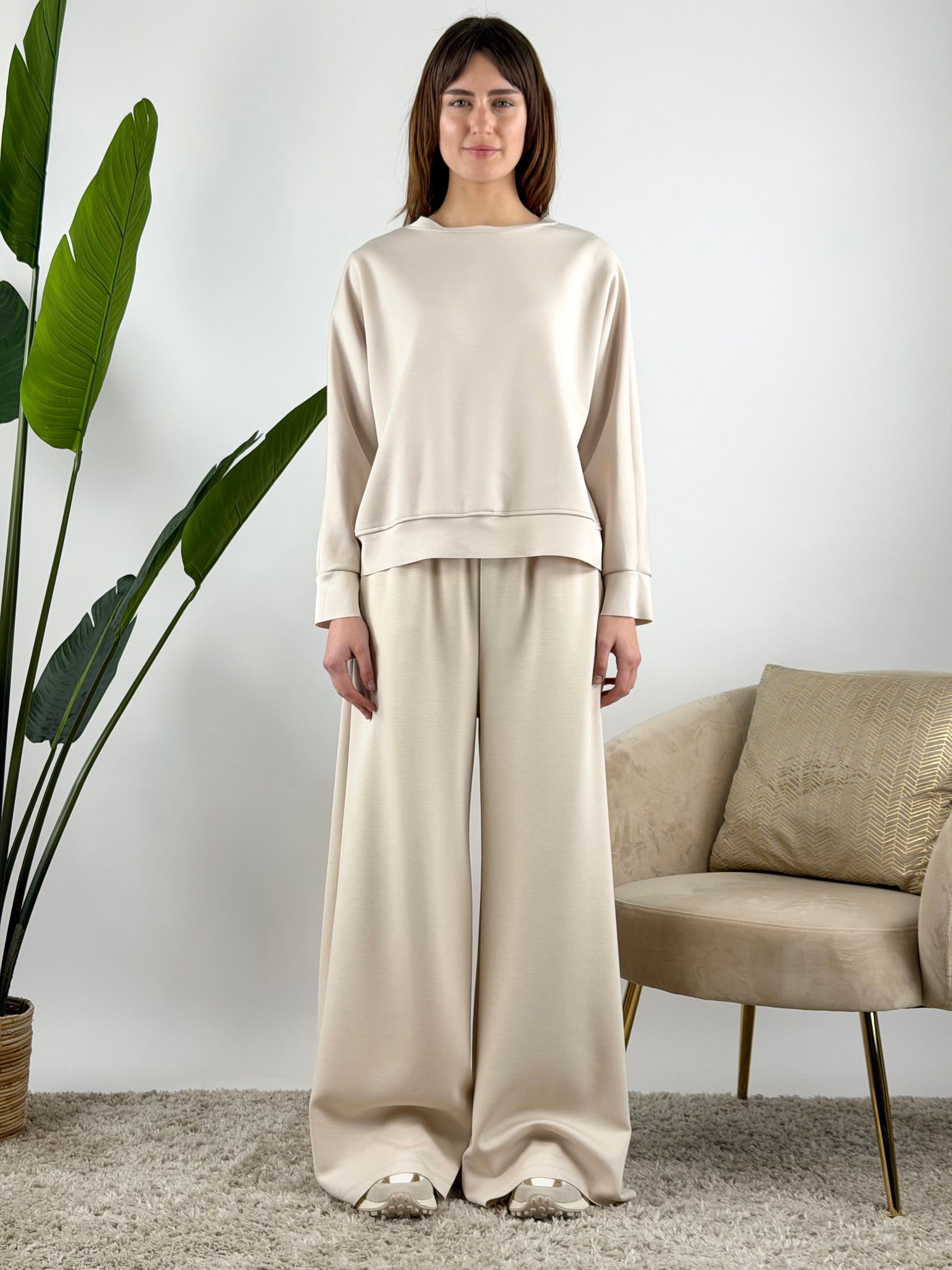 - Tuta scuba composta da maglia girocollo a scatola con spacchi laterali e pantalone a palazzo con elastico in vita