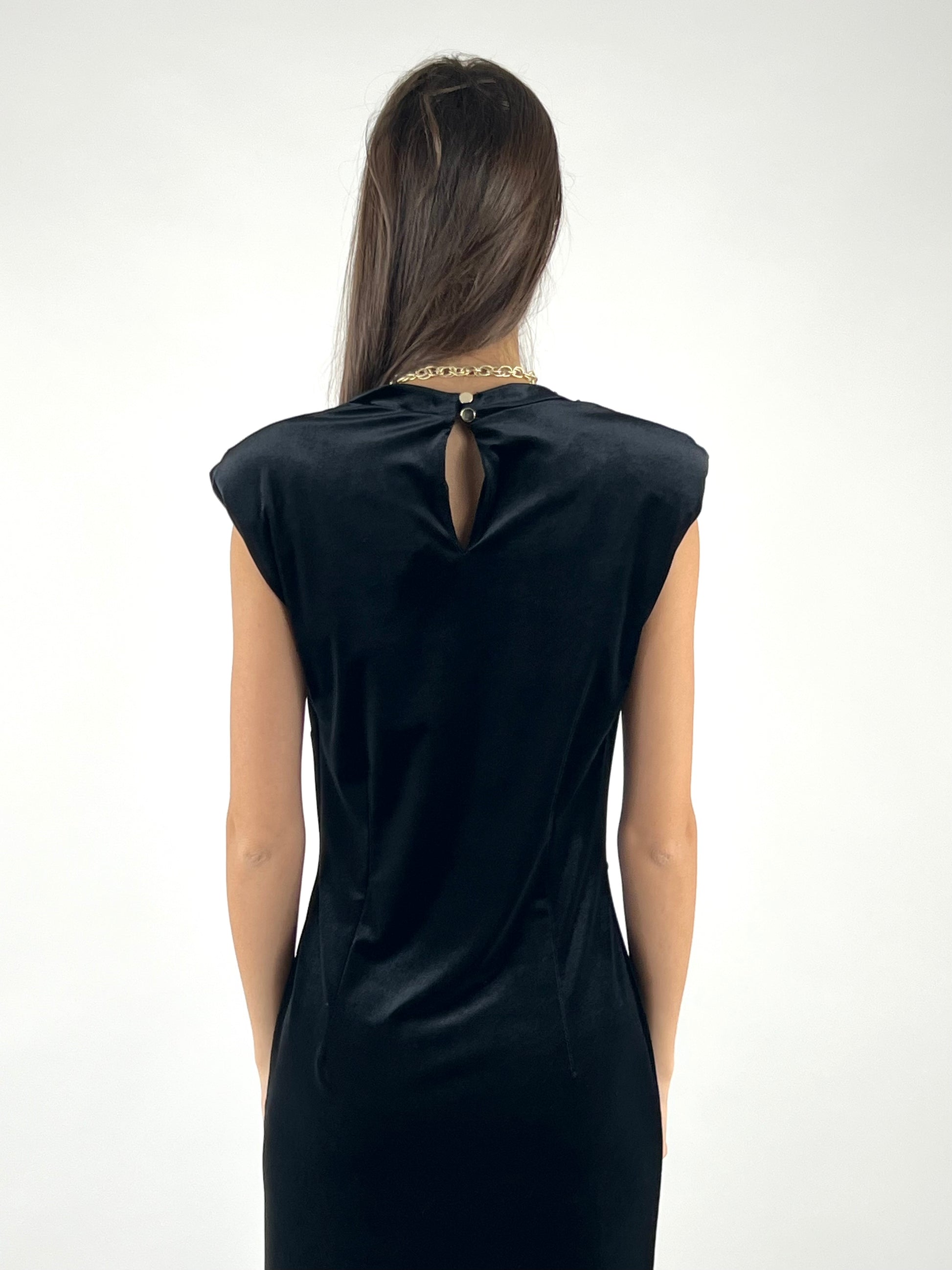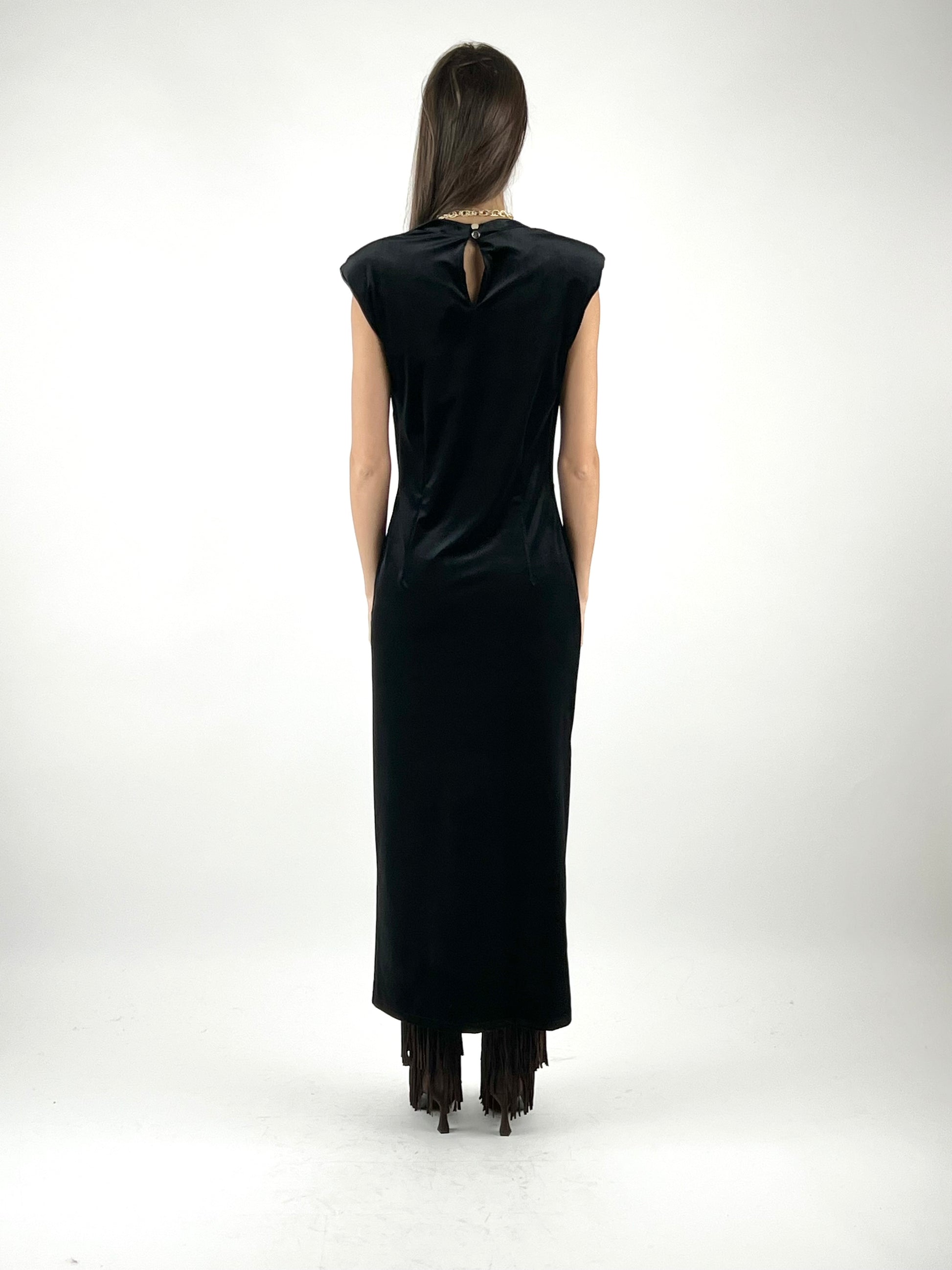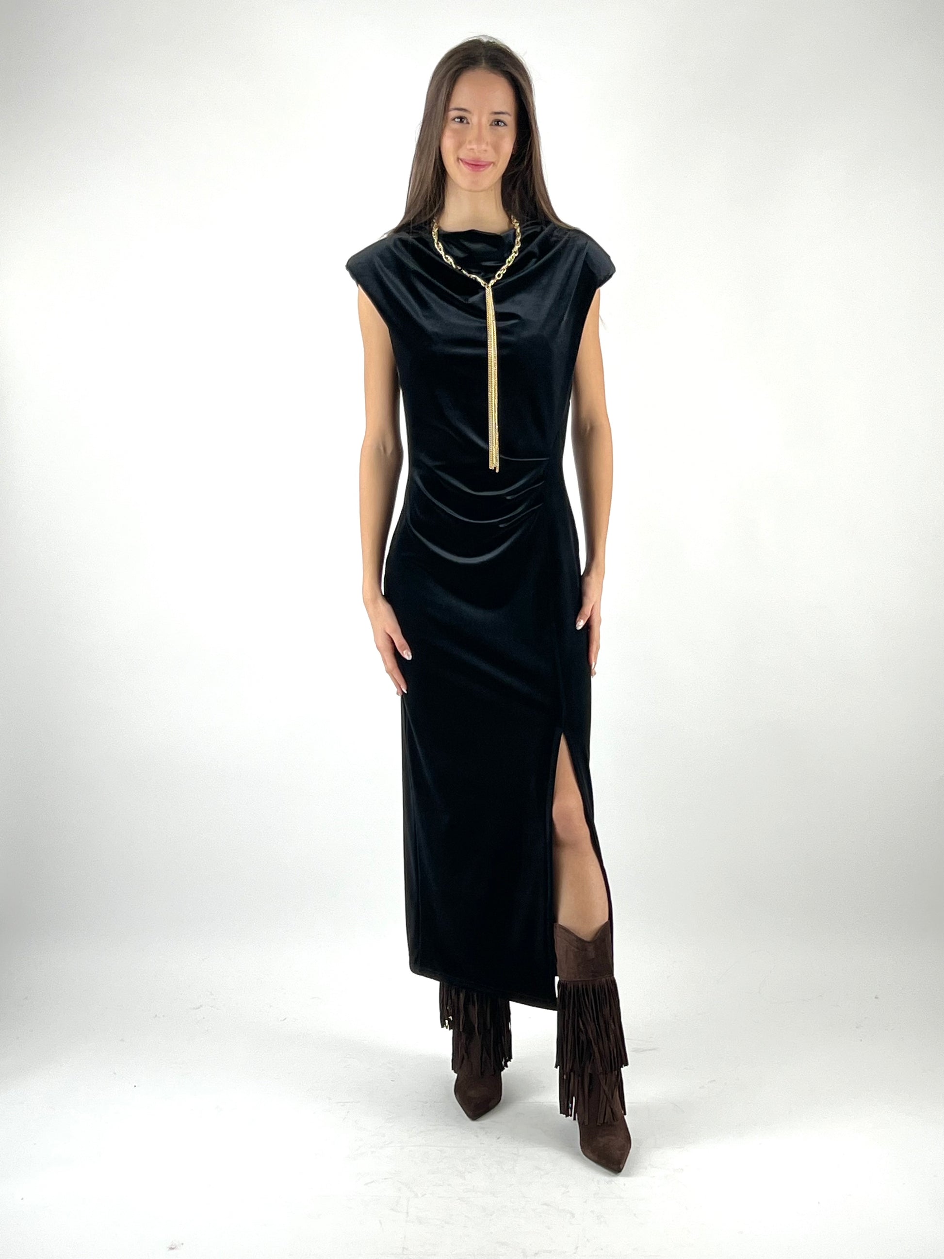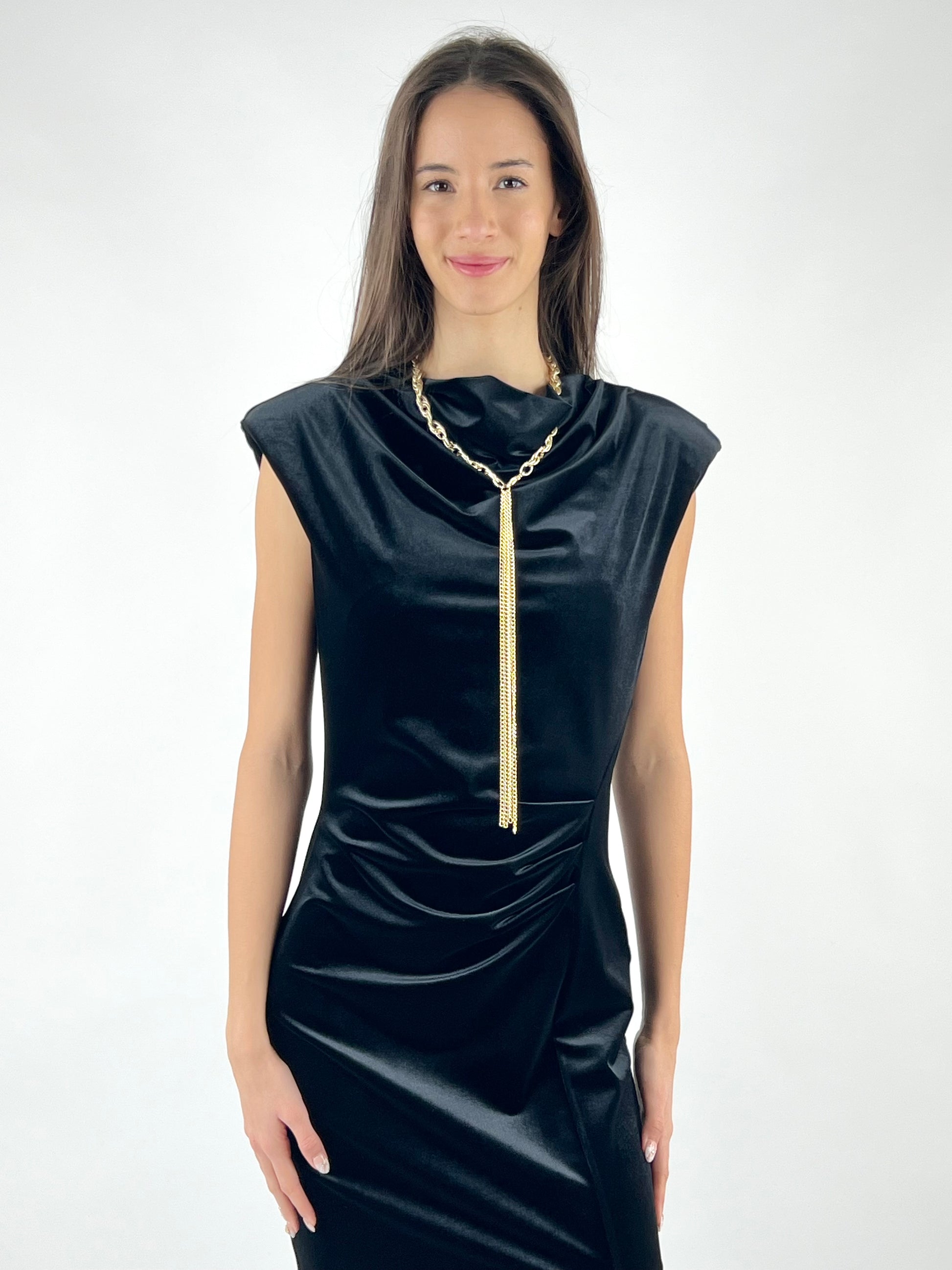 • Abito lungo in ciniglia con spallina leggermente imbottita, collo a cratere, drappeggio laterale, spacco laterale e collana