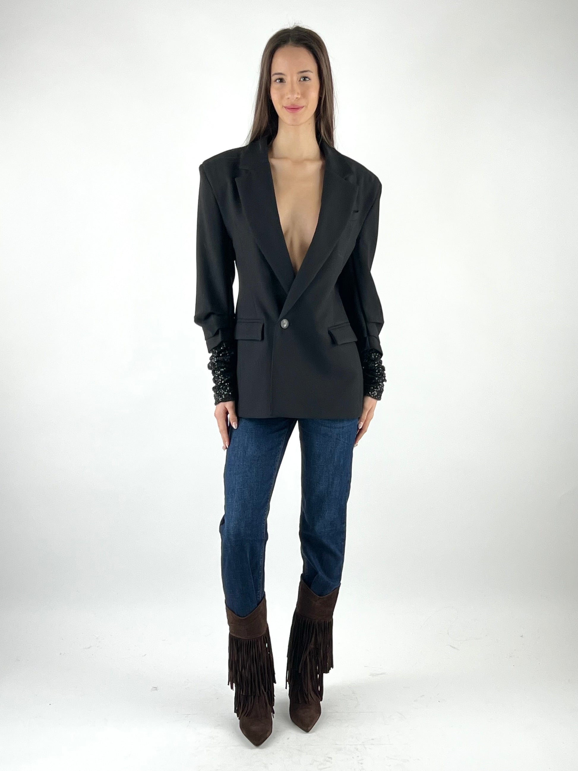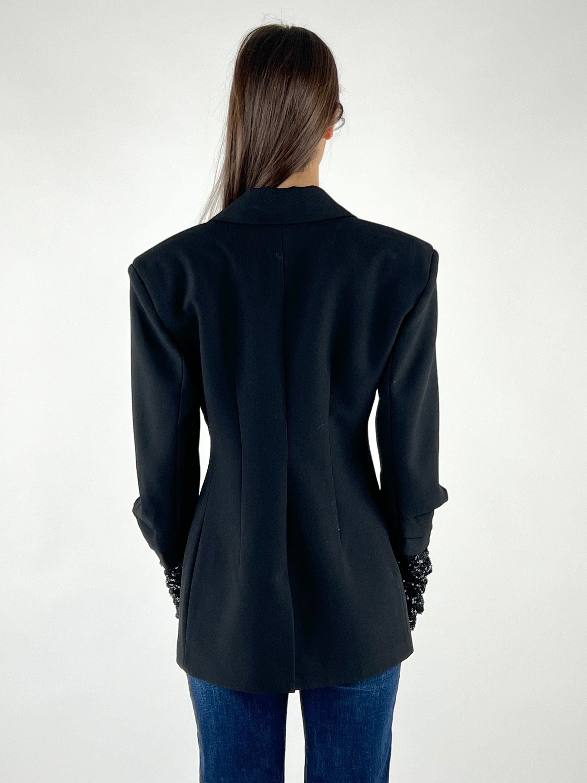 - Giacca doppiopetto con spalla imbottita e maniche in paillettes