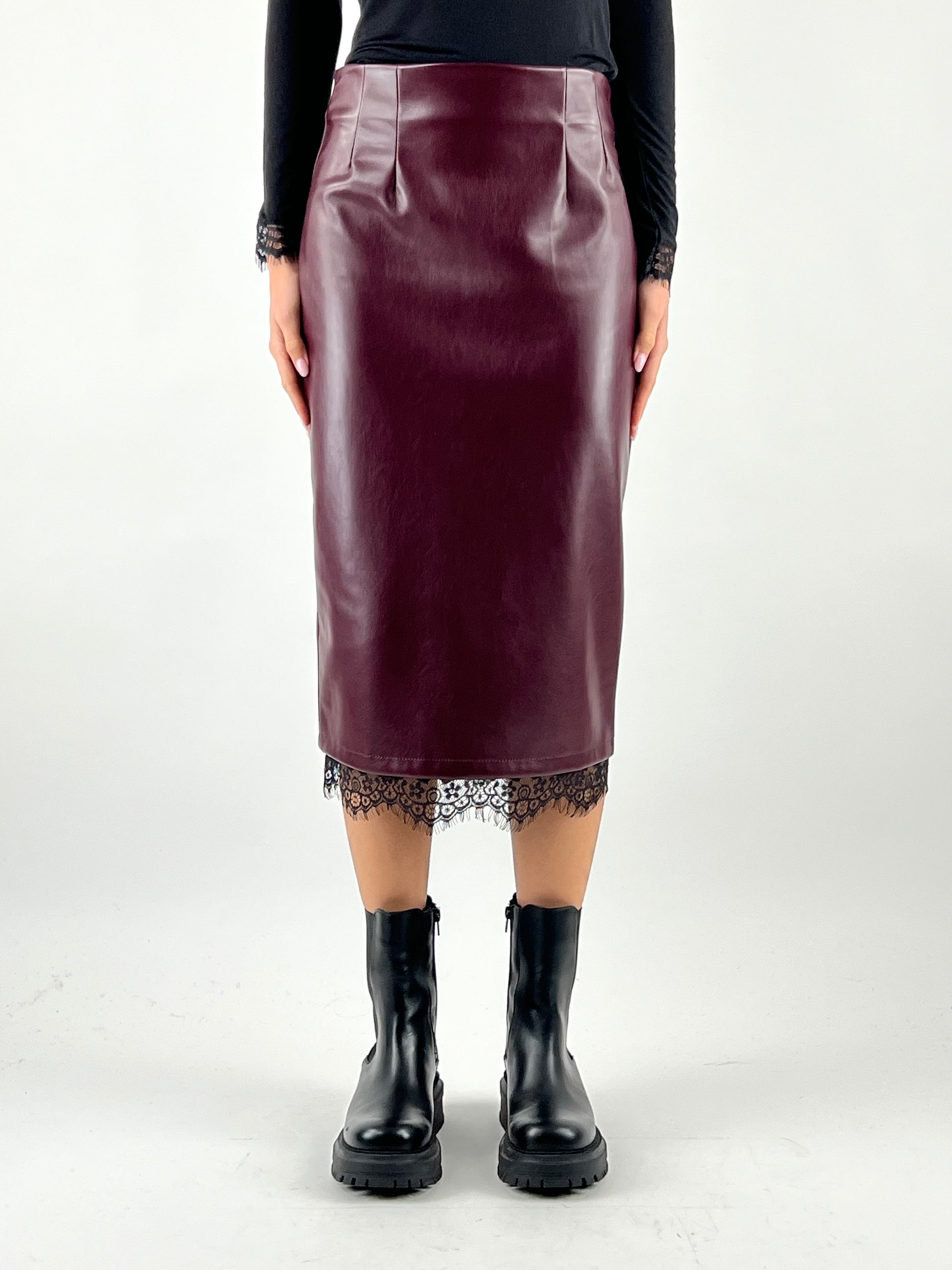 - Gonna a tubino in ecopelle con bordo in pizzo e spacco posteriore