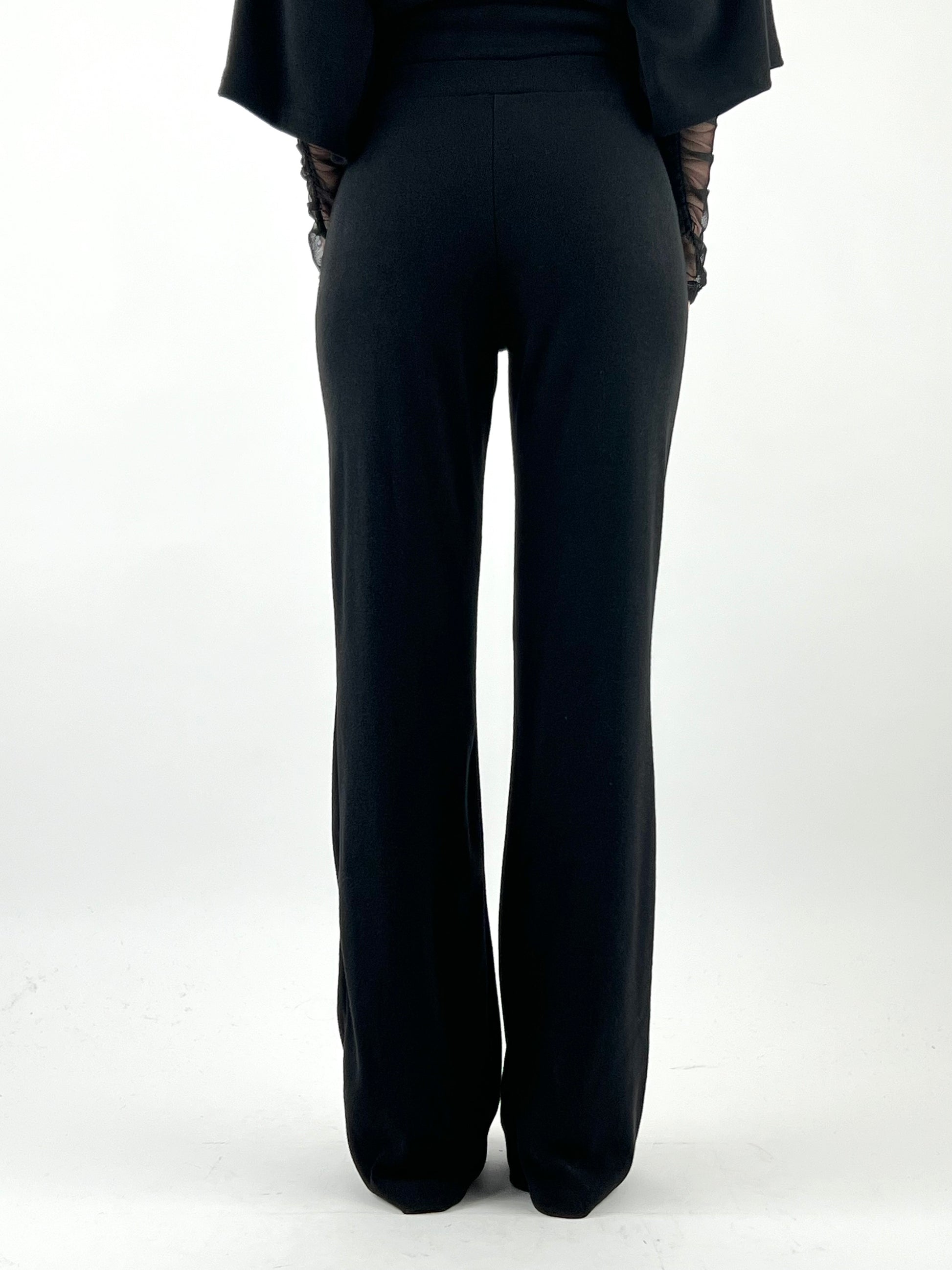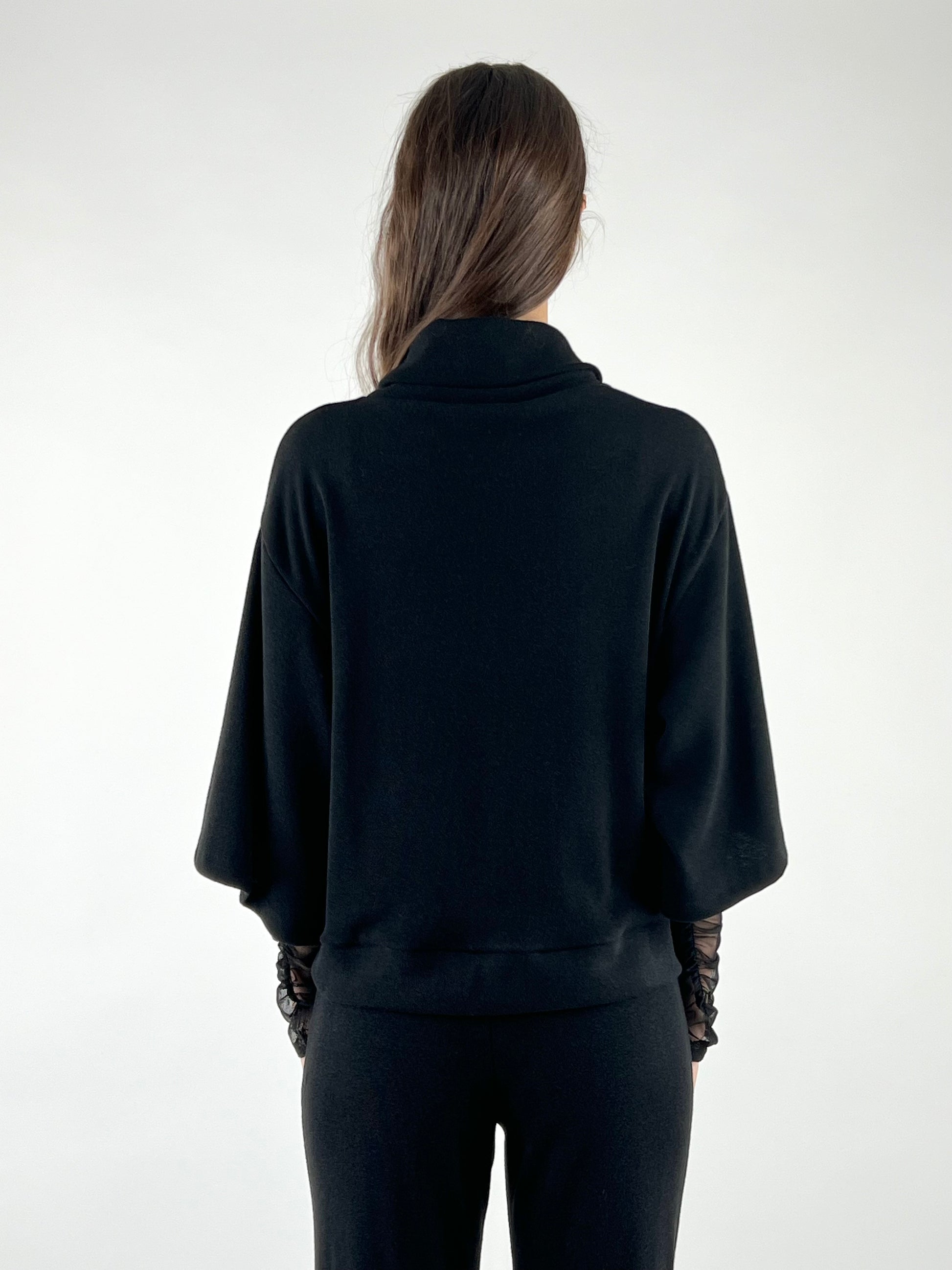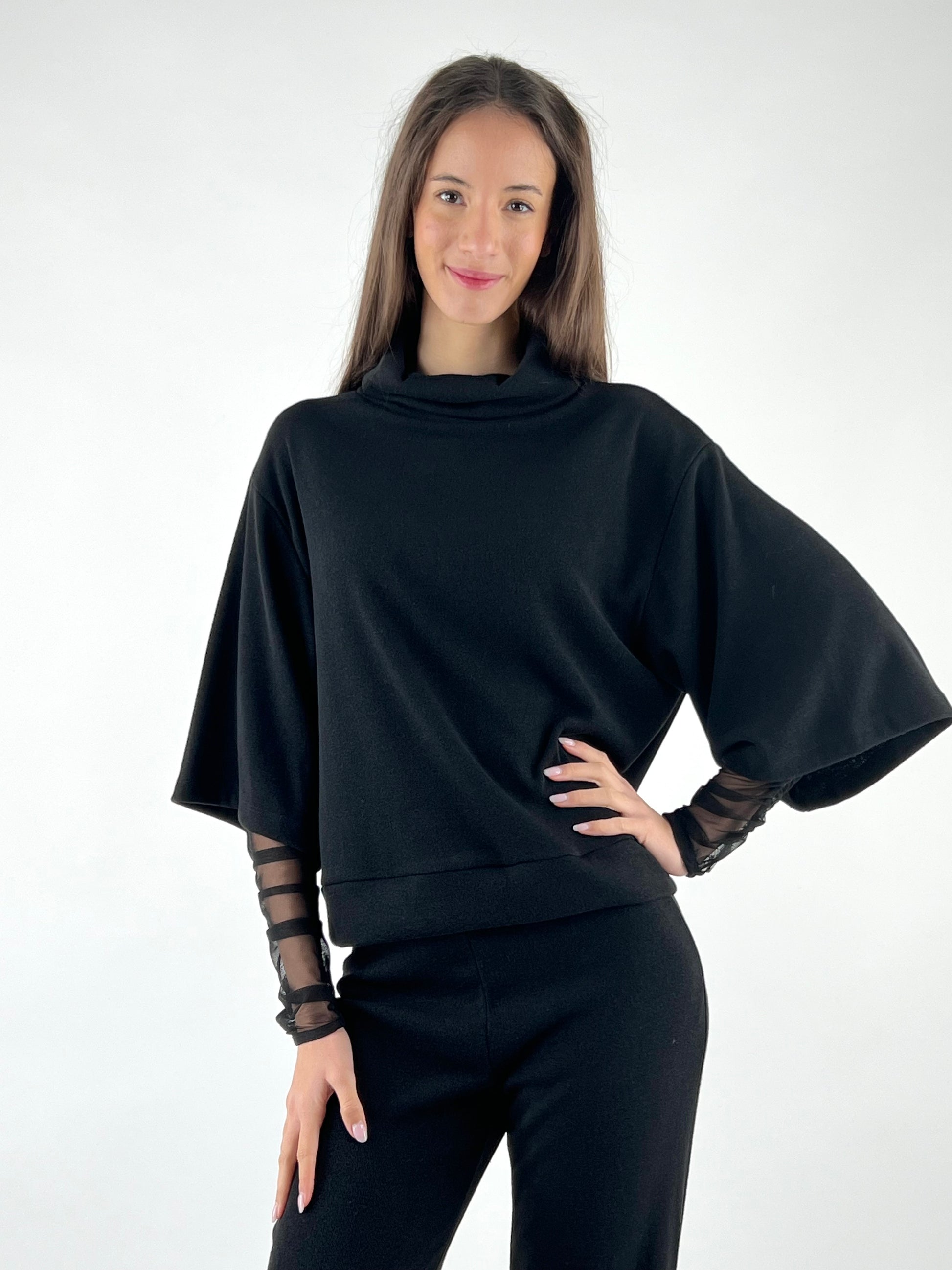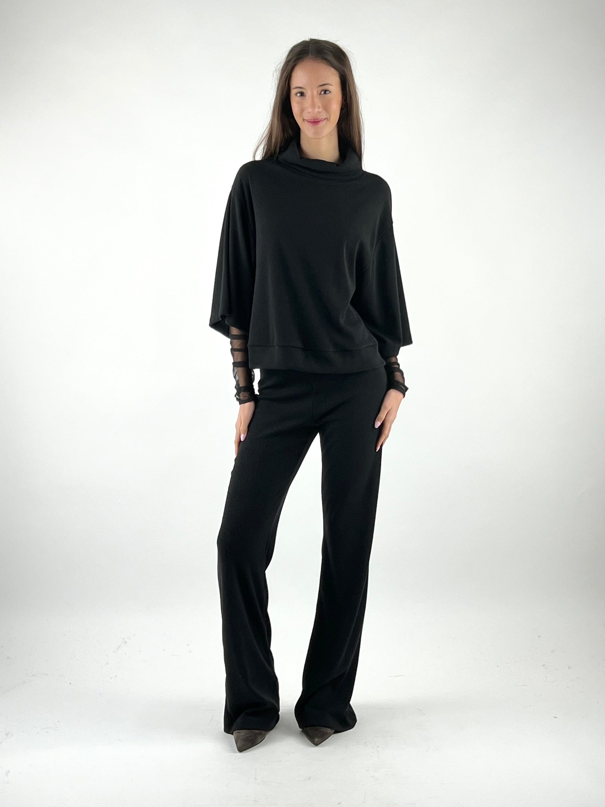 - Tuta in maglia composta da dolcevita con manica raglan al gomito, manicotti in tulle e pantalone con gamba dritta ed elastico sul punto vita