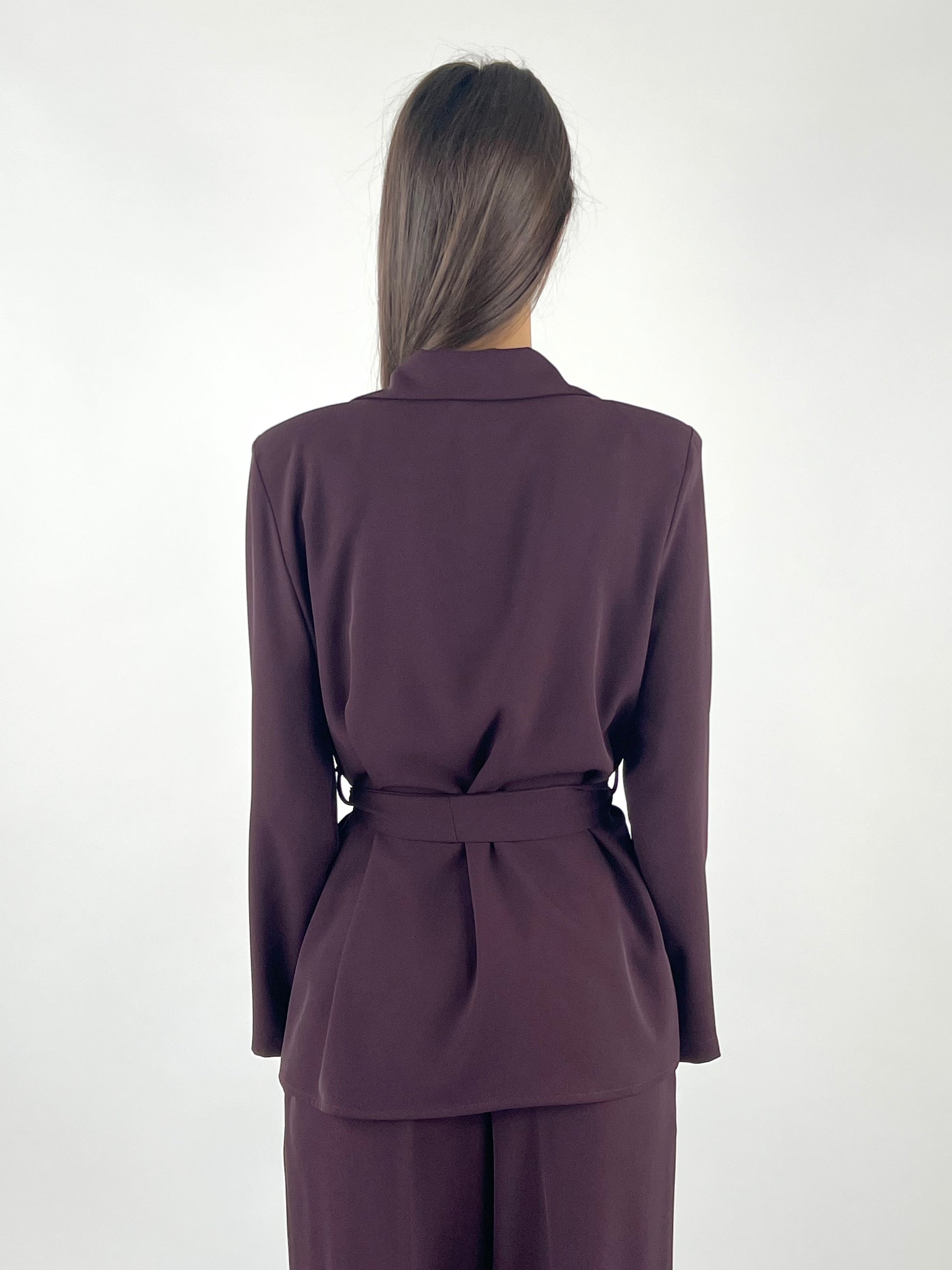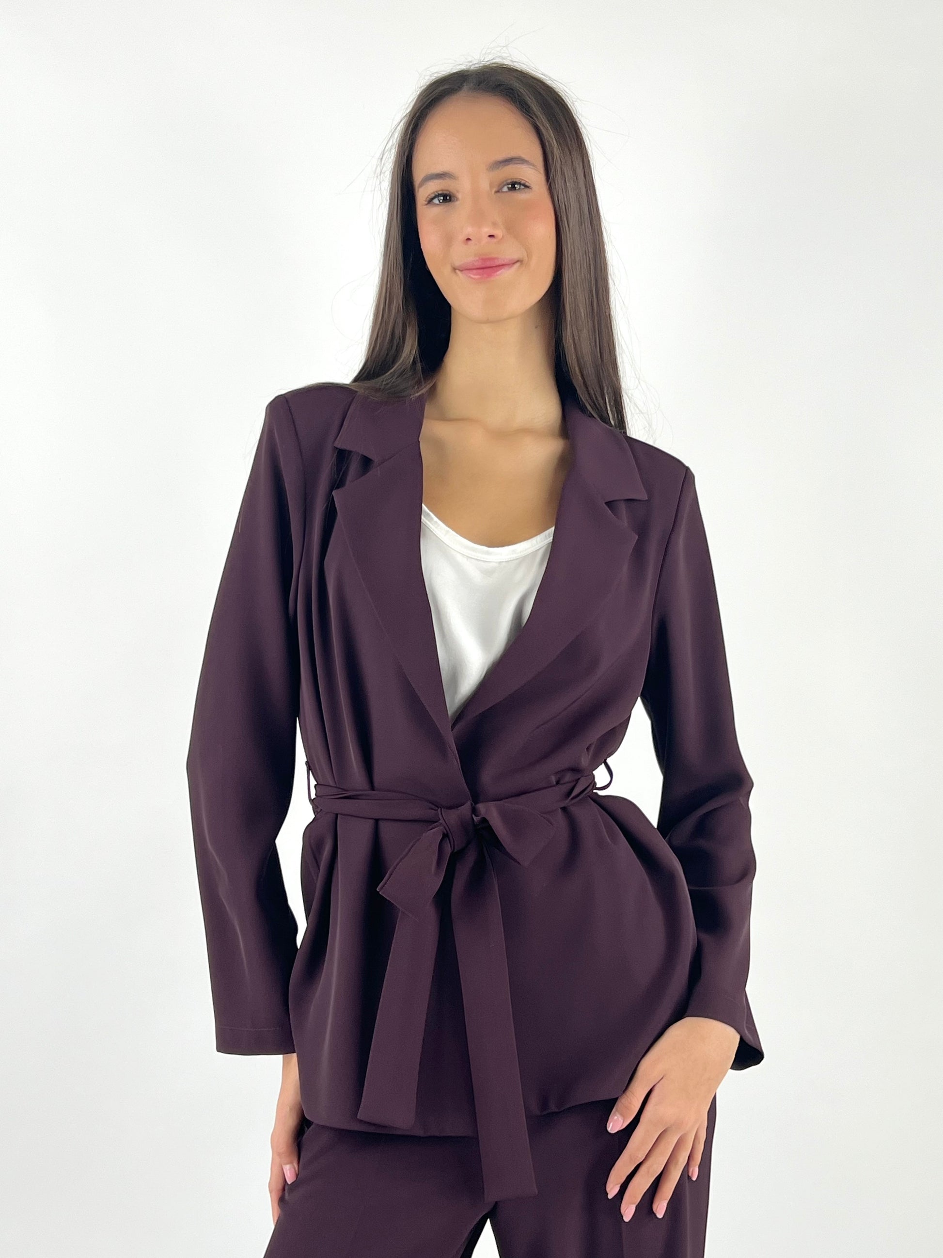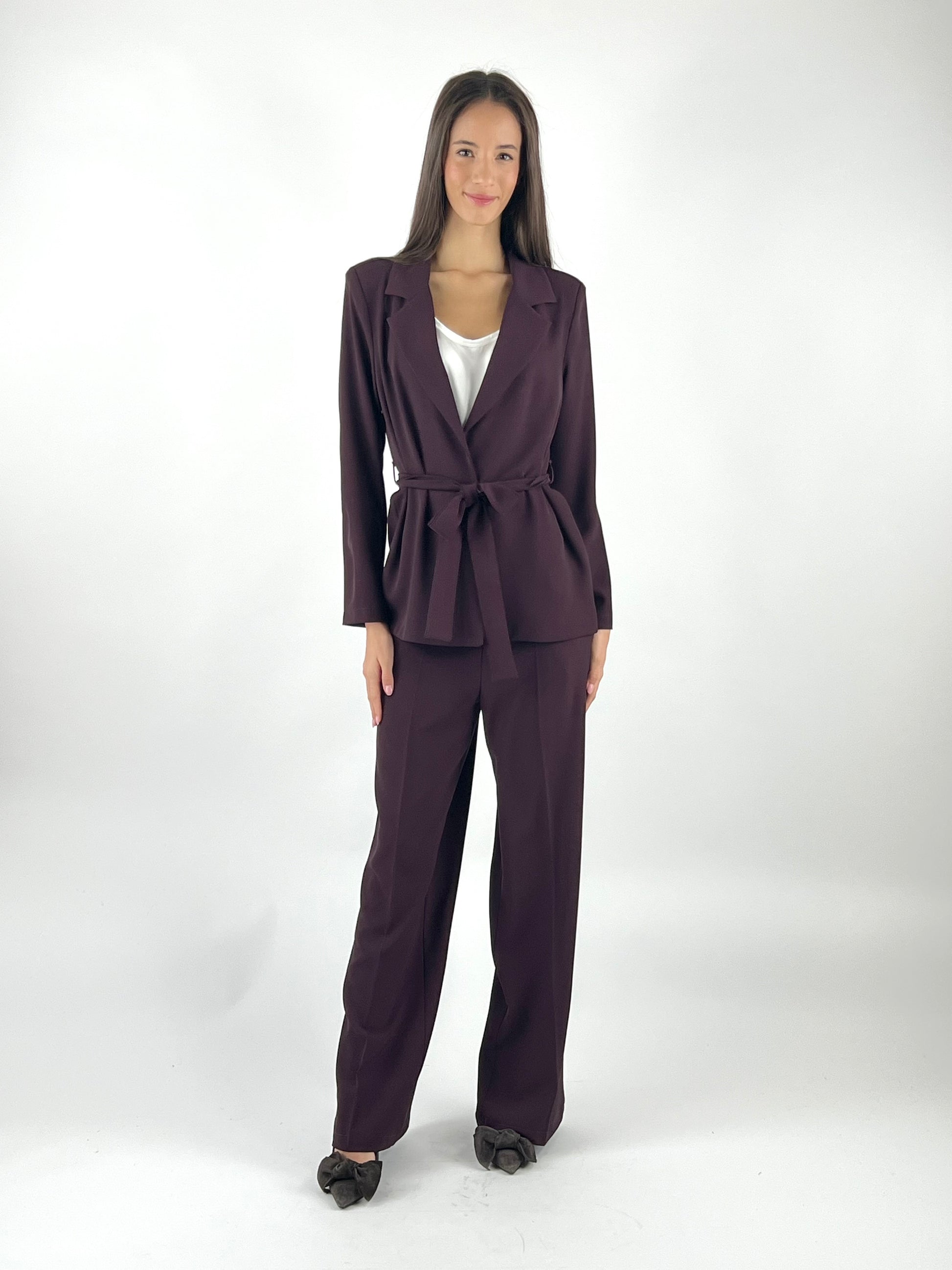 - Completo fluido composto da giacca con cintura e pantalone con gamba morbida ed elastico in vita