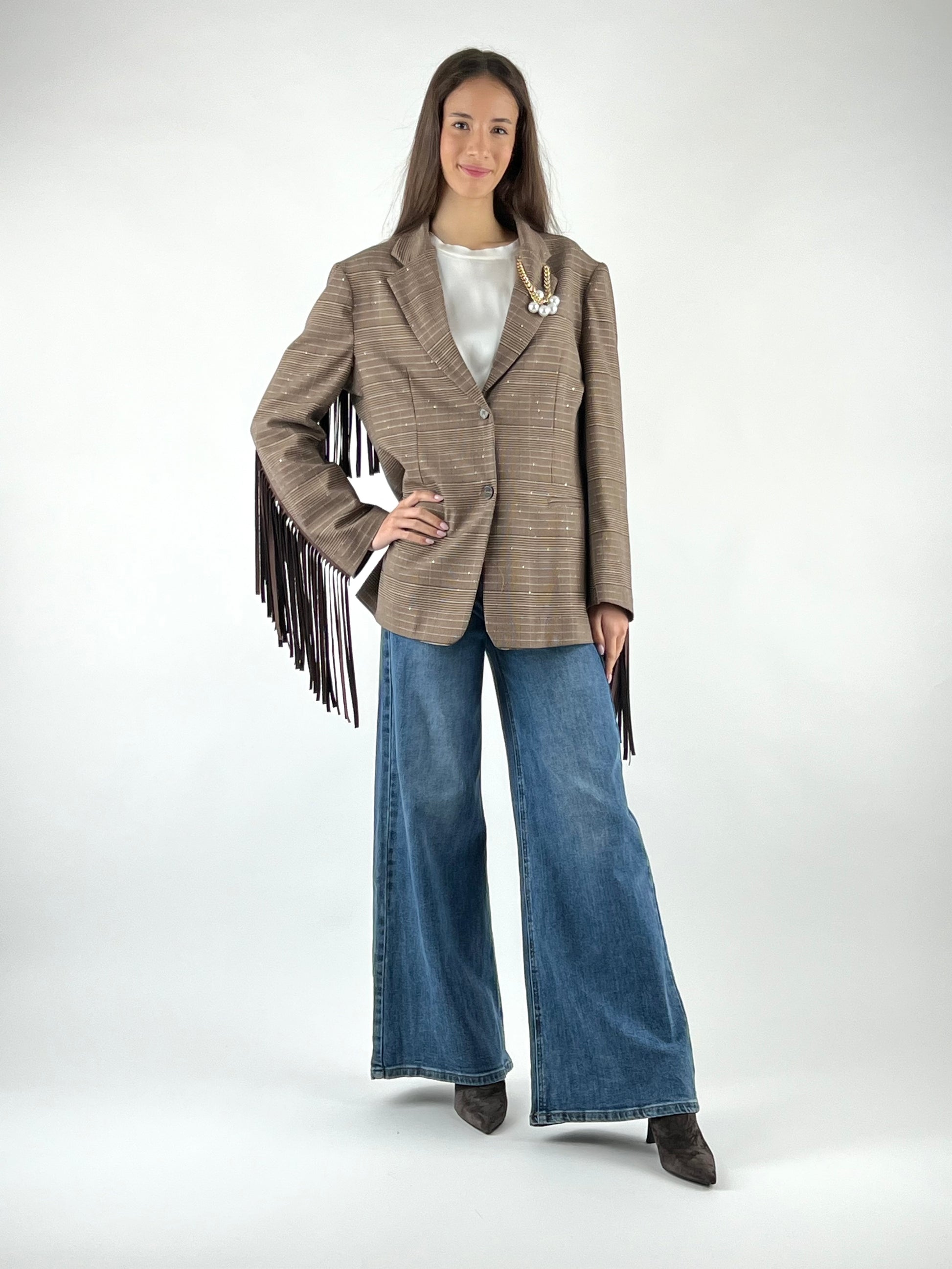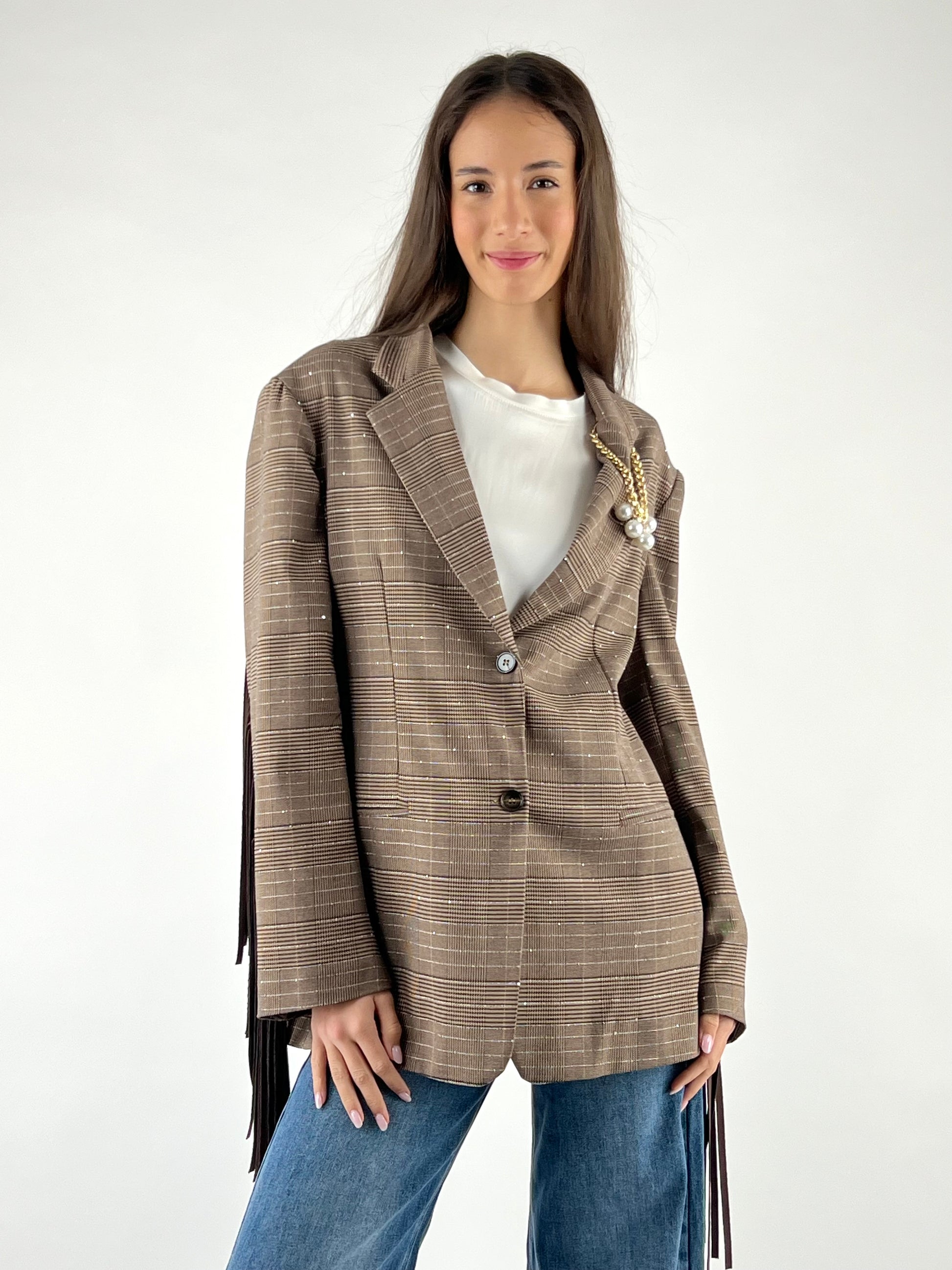 - Giacca over monopetto con spilla, micropaillettes e frange