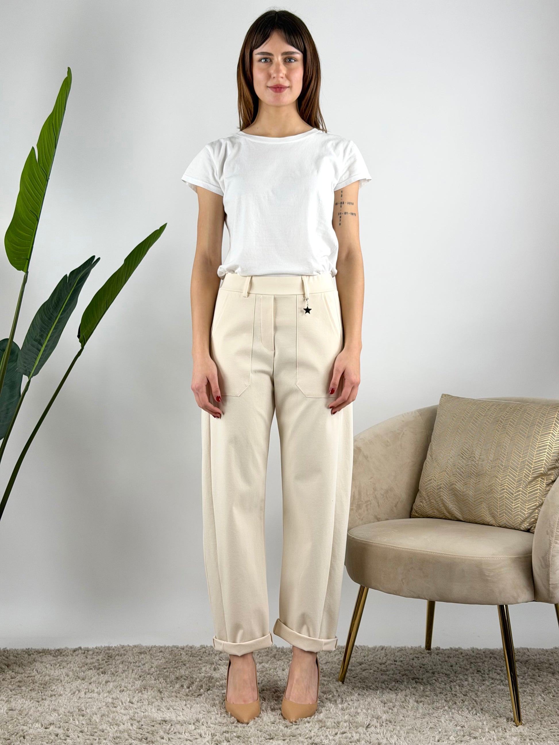 • Pantalone in punto Milano con tasche frontali, elastico in vita e stellina